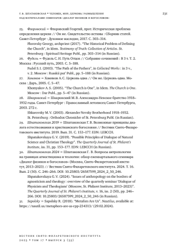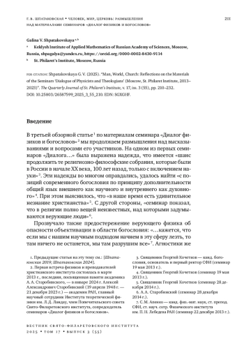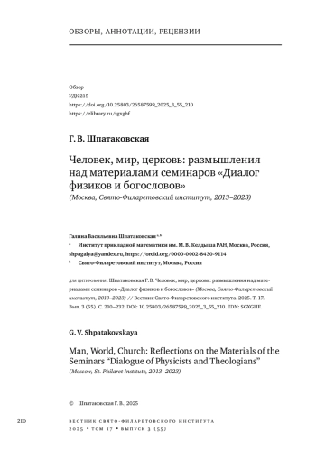 ШПАТАКОВСКАЯ Г. В. ЧЕЛОВЕК, МИР, ЦЕРКОВЬ: РАЗМЫШЛЕНИЯ НАД МАТЕРИАЛАМИ СЕМИНАРОВ «ДИАЛОГ ФИЗИКОВ И БОГОСЛОВОВ» (МОСКВА, СВЯТО-ФИЛАРЕТОВСКИЙ ИНСТИТУТ, 2013-2023) // ВЕСТНИК СВЯТО-ФИЛАРЕТОВСКОГО ИНСТИТУТА. 2025. № 3 (55), ТОМ 17