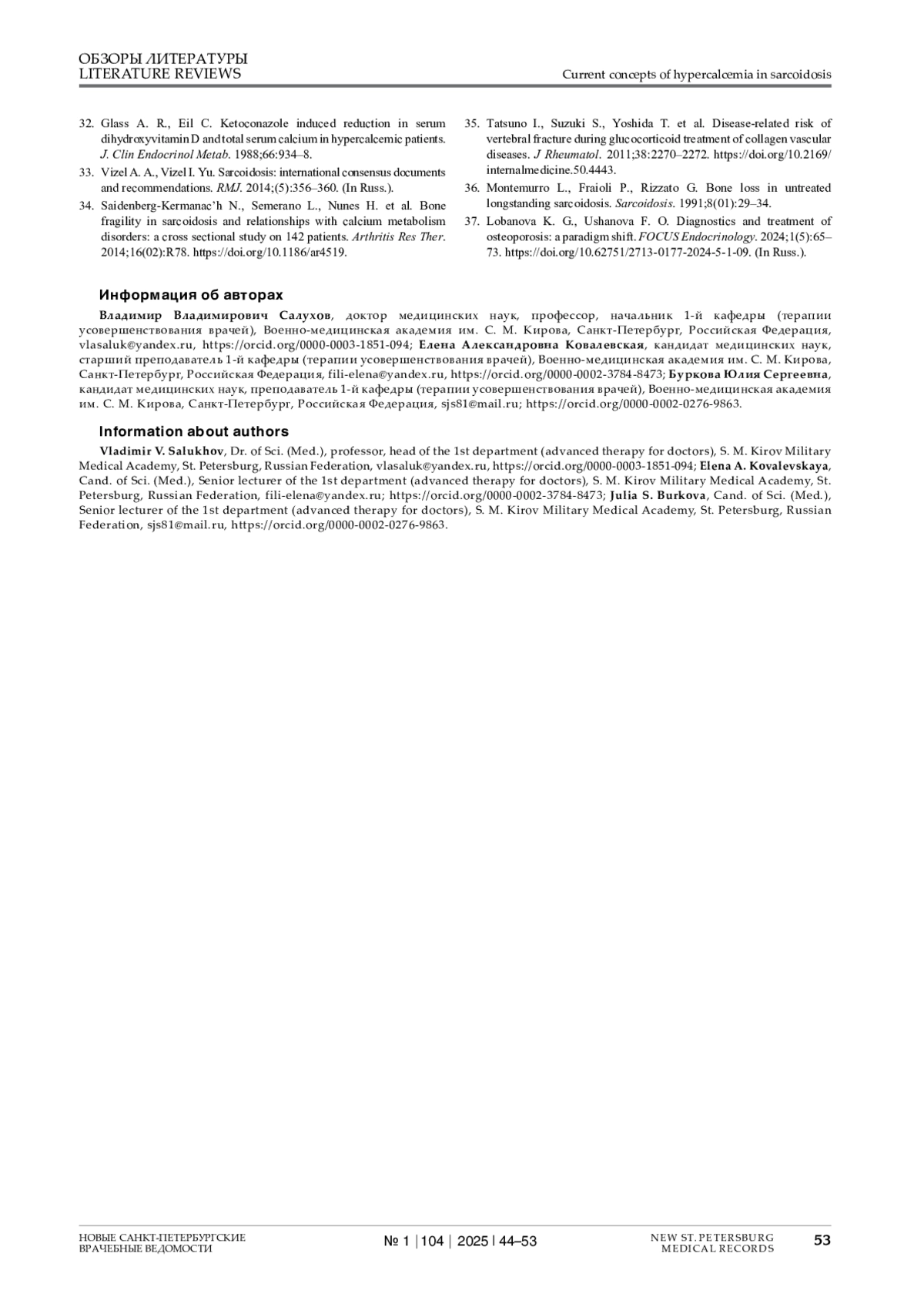 20. 	Baughman R. P., Papanikolaou I. Current concepts regarding calcium metabolism and bone health in sarcoidosis // Curr. Opin. Pulm. Med. 2017. Vol. 23. P. 000-000. DOI: 10.1097/MCP.0000000000000400