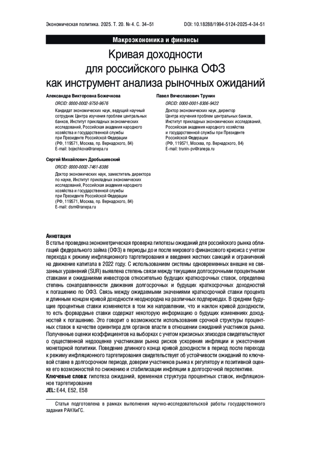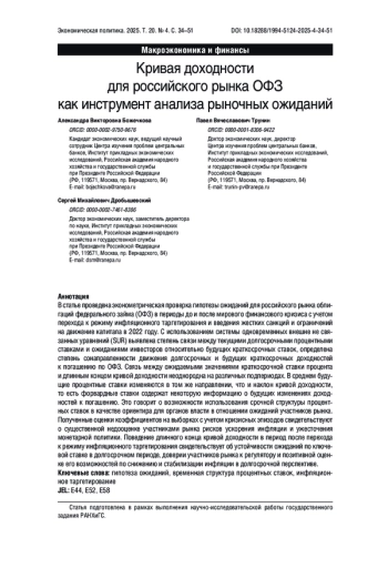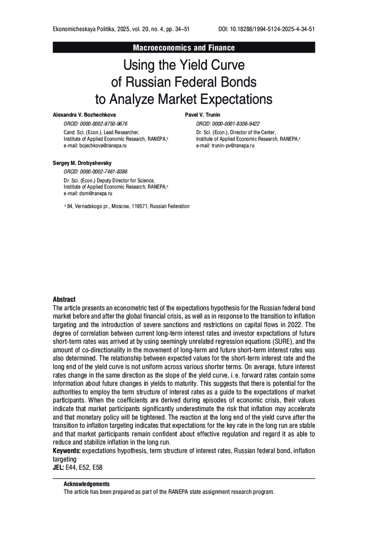 В статье проведена эконометрическая проверка гипотезы ожиданий для российского рынка облигаций федерального займа (ОФЗ) в периоды до и после мирового финансового кризиса с учетом перехода к режиму инфляционного таргетирования и введения жестких санкций и ограничений на движение капитала в 2022 году. С использованием системы одновременных внешне не связанных уравнений (SUR) выявлена степень связи между текущими долгосрочными процентными ставками и ожиданиями инвесторов относительно будущих краткосрочных ставок, определена степень сонаправленности движения долгосрочных и будущих краткосрочных доходностей к погашению по ОФЗ. Связь между ожидаемыми значениями краткосрочной ставки процента и длинным концом кривой доходности неоднородна на различных подпериодах. В среднем будущие процентные ставки изменяются в том же направлении, что и наклон кривой доходности, то есть форвардные ставки содержат некоторую информацию о будущих изменениях доходностей к погашению. Это говорит о возможности использования срочной структуры процентных ставок в качестве ориентира для органов власти в отношении ожиданий участников рынка. Полученные оценки коэффициентов на выборках с учетом кризисных эпизодов свидетельствуют о существенной недооценке участниками рынка рисков ускорения инфляции и ужесточения монетарной политики. Поведение длинного конца кривой доходности в период после перехода к режиму инфляционного таргетирования свидетельствует об устойчивости ожиданий по ключевой ставке в долгосрочном периоде, доверии участников рынка к регулятору и позитивной оценке его возможностей по снижению и стабилизации инфляции в долгосрочной перспективе.