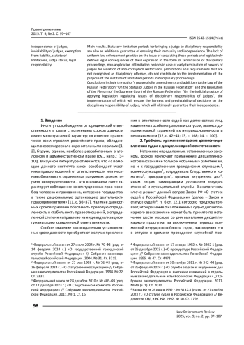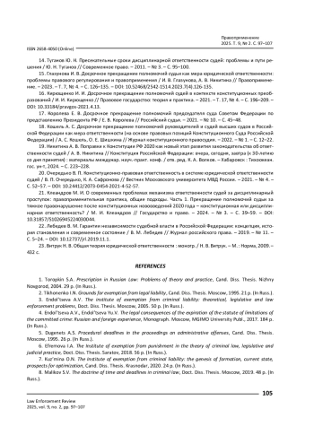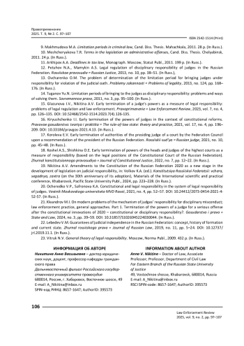 21. 	Клеандров М. И. О современных проблемах механизма ответственности судей за дисциплинарный проступок: правоприменительная практика, общие подходы. Часть 1. Прекращение полномочий судьи за тяжкое правонарушение после конституционных нововведений 2020 года - конституционная или дисциплинарная ответственность? / М. И. Клеандров // Государство и право. - 2024. - № 3. - С. 39-59. -. DOI: 10.31857/S1026945224030044