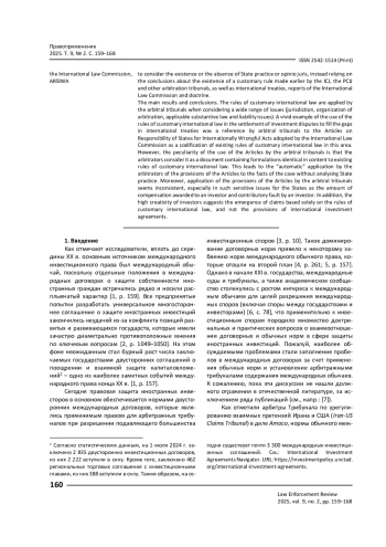 Представлен анализ практики арбитражных трибуналов по вопросам толкования и применения международных обычаев при разрешении инвестиционных споров. Делается вывод, что арбитры не склонны анализировать вопросы наличия или отсутствия устойчивой практики государств или opinio juris как элементов формирования обычая. Они опираются на выводы о наличии обычной нормы, сделанные ранее другими международными судами и трибуналами или исследователями. Арбитры руководствуются Статьями об ответственности государств за международно-противоправные деяния 2001 г. (Статьи), рассматривая их как документ, содержащий положения, идентичные существующим международным обычаям. Однако применение положений Статей отличается непоследовательностью, особенно в чувствительных для государств вопросах, связанных с выплатой компенсации инвесторам. В будущем высока вероятность возникновения инвестиционных споров, основанных исключительно на нормах международного обычного права.