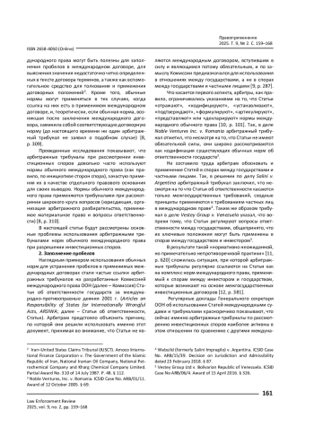 В результате такой «нормативно неожиданной, но примечательно непротиворечивой практики» [11, p. 620] сложилась ситуация, при которой арбитражные трибуналы регулярно ссылаются на Статьи как на комплекс норм международного права, применимый к спорам между инвестором и государством, которые возникают на основе межгосударственных инвестиционных договоров [12, p. 381].