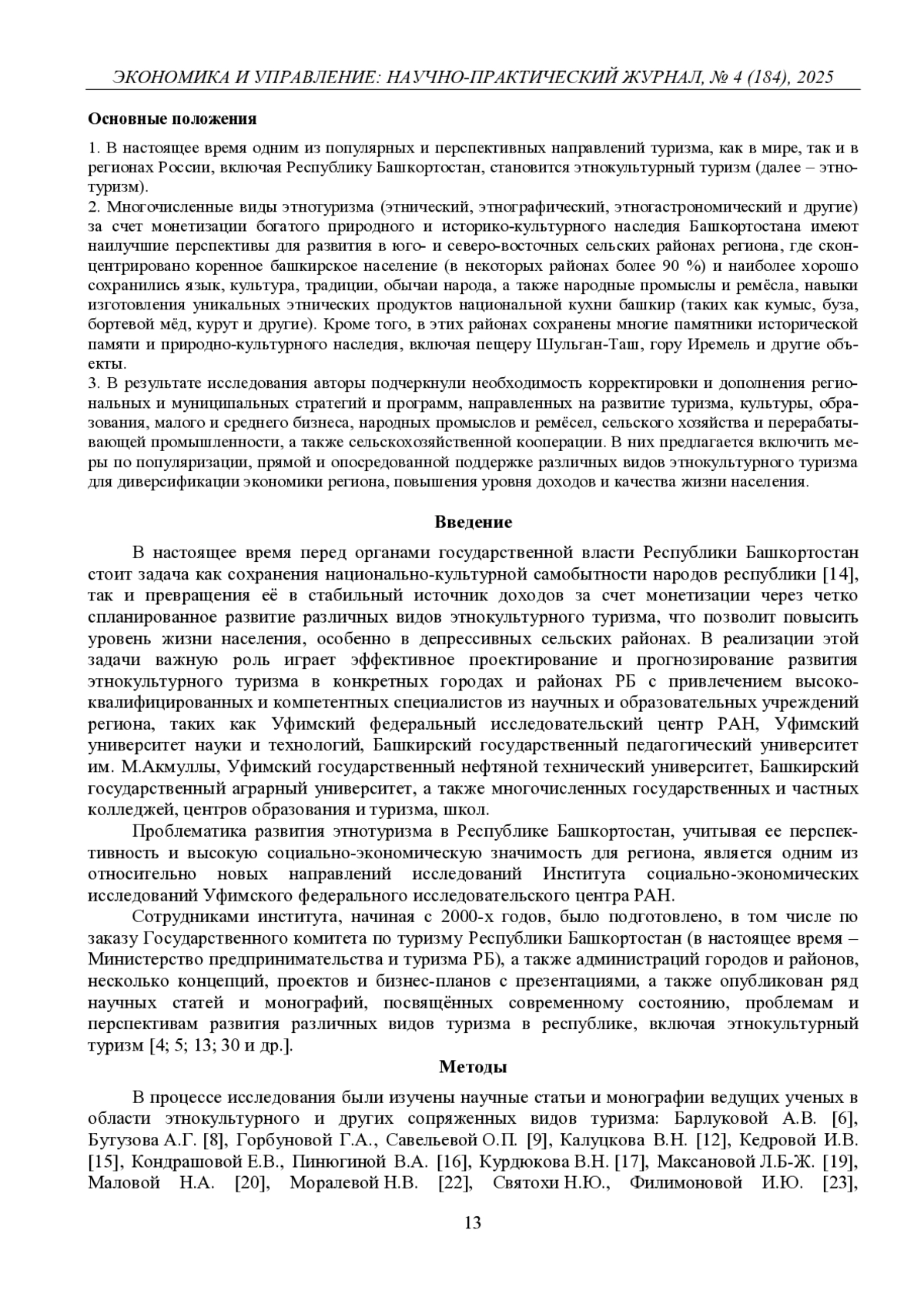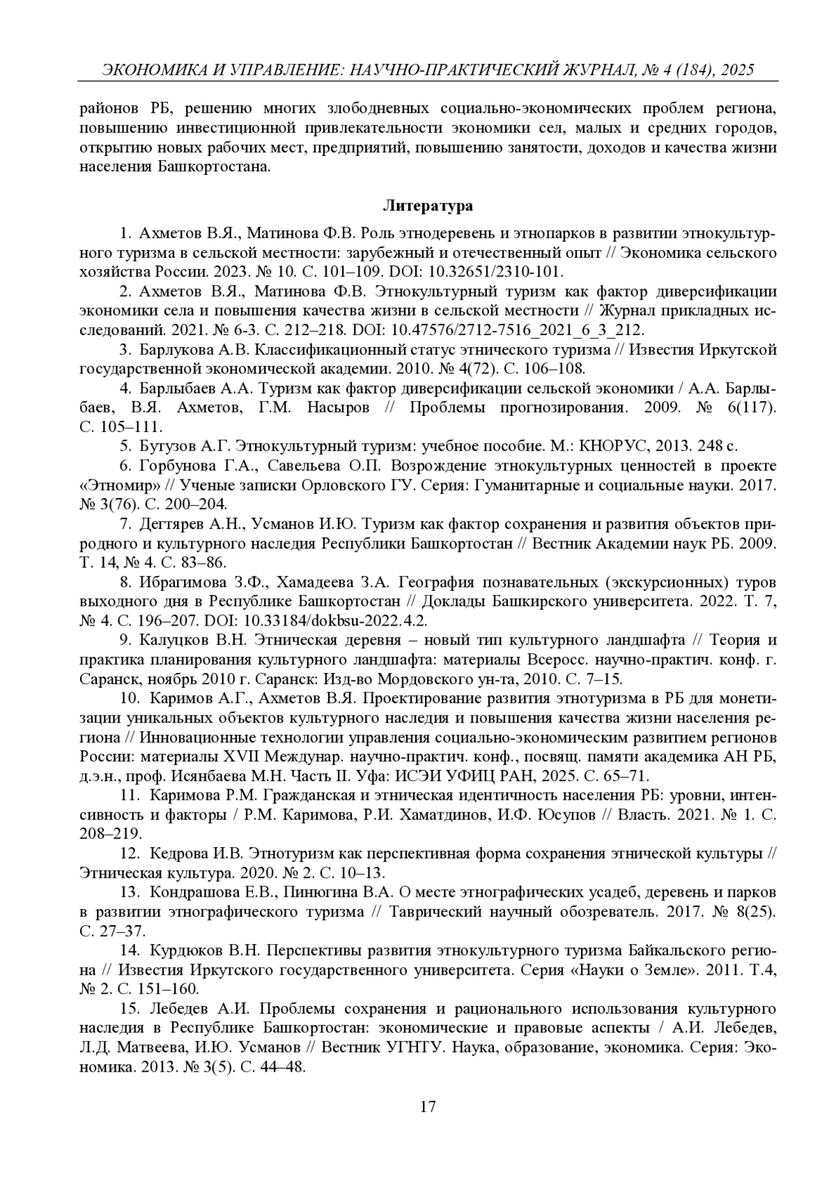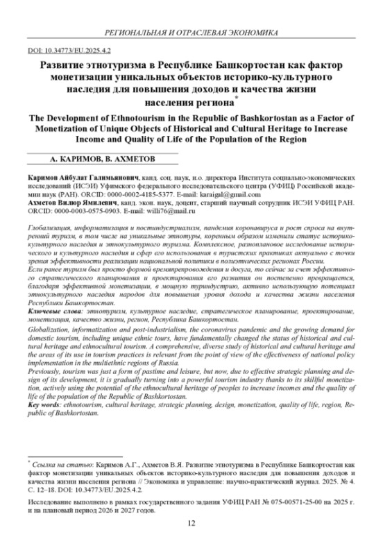 КАРИМОВ А. Г., АХМЕТОВ В. Я. РАЗВИТИЕ ЭТНОТУРИЗМА В РЕСПУБЛИКЕ БАШКОРТОСТАН КАК ФАКТОР МОНЕТИЗАЦИИ УНИКАЛЬНЫХ ОБЪЕКТОВ ИСТОРИКО-КУЛЬТУРНОГО НАСЛЕДИЯ ДЛЯ ПОВЫШЕНИЯ ДОХОДОВ И КАЧЕСТВА ЖИЗНИ НАСЕЛЕНИЯ РЕГИОНА // ЭКОНОМИКА И УПРАВЛЕНИЕ: НАУЧНО-ПРАКТИЧЕСКИЙ ЖУРНАЛ. 2025. № 4 (184)