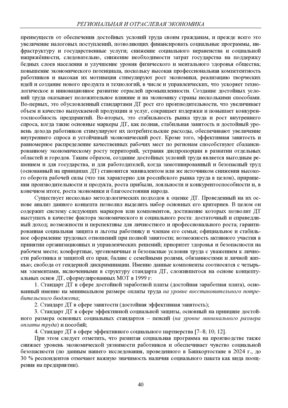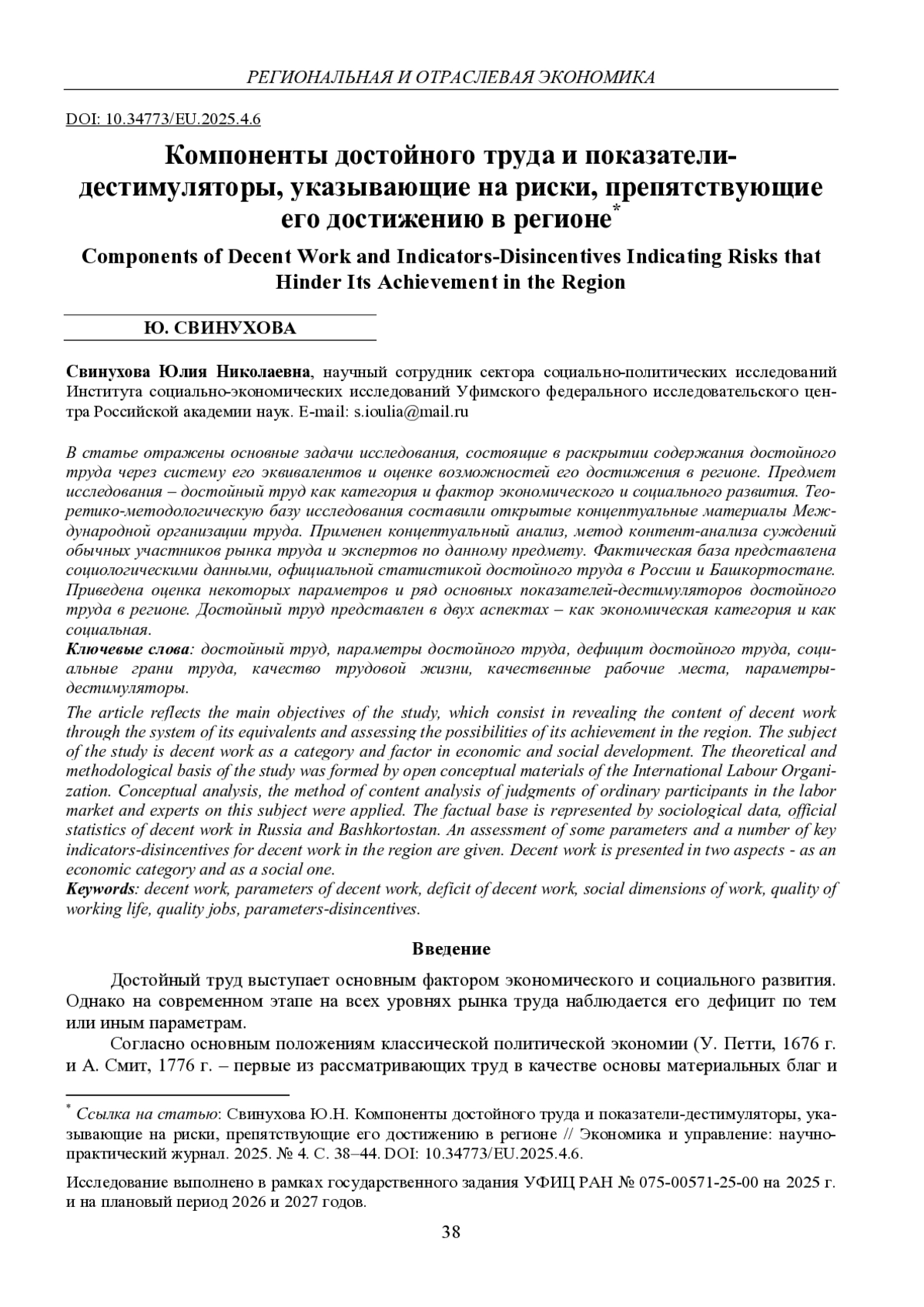 В статье отражены основные задачи исследования, состоящие в раскрытии содержания достойного труда через систему его эквивалентов и оценке возможностей его достижения в регионе. Предмет исследования – достойный труд как категория и фактор экономического и социального развития. Теоретико-методологическую базу исследования составили открытые концептуальные материалы Международной организации труда. Применен концептуальный анализ, метод контент-анализа суждений обычных участников рынка труда и экспертов по данному предмету. Фактическая база представлена социологическими данными, официальной статистикой достойного труда в России и Башкортостане. Приведена оценка некоторых параметров и ряд основных показателей-дестимуляторов достойного труда в регионе. Достойный труд представлен в двух аспектах – как экономическая категория и как социальная