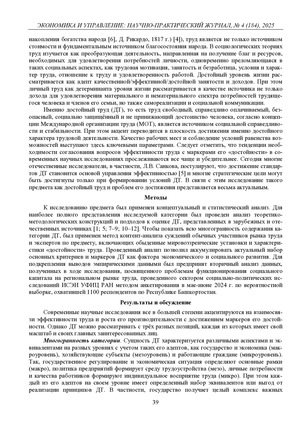 5. 	Санкова Л.В. Эффективность труда и достойный труд в современной России // Вестник Саратовского государственного социально-экономического университета. 2014. № 5. С. 35-40.  EDN: TGFEUF