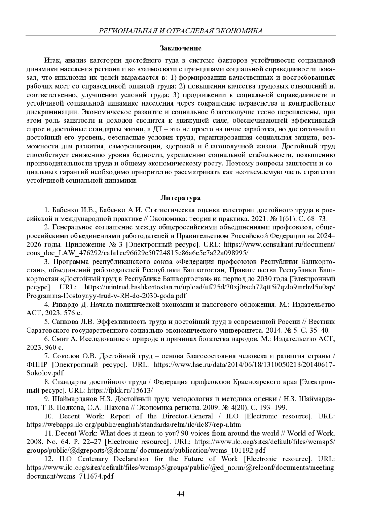 1. 	Бабенко И.В., Бабенко А.И. Статистическая оценка категории достойного труда в российской и международной практике // Экономика: теория и практика. 2021. № 1(61). С. 68-73.  EDN: PWOWMI