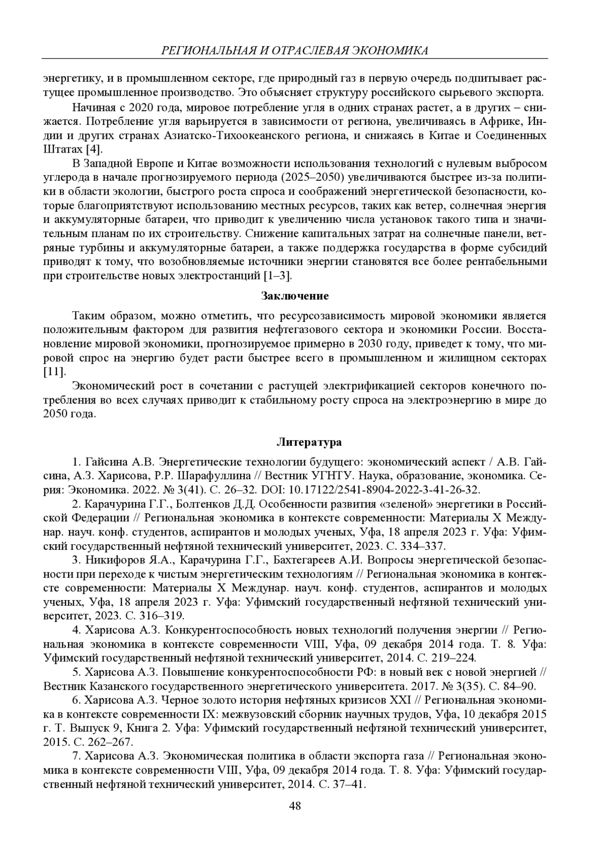 1. 	Гайсина А.В. Энергетические технологии будущего: экономический аспект / А.В. Гайсина, А.З. Харисова, Р.Р. Шарафуллина // Вестник УГНТУ. Наука, образование, экономика. Серия: Экономика. 2022. № 3(41). С. 26-32.  DOI: 10.17122/2541-8904-2022-3-41-26-32