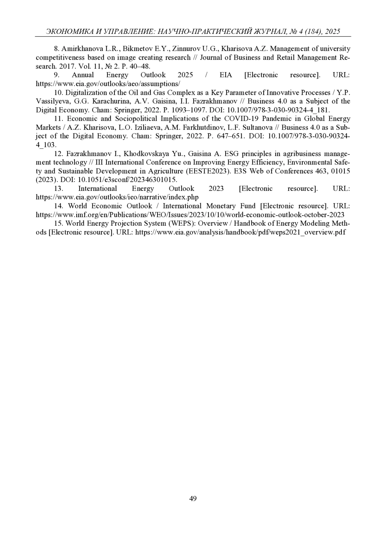 11. 	Economic and Sociopolitical Implications of the COVID-19 Pandemic in Global Energy Markets / A.Z. Kharisova, L.O. Iziliaeva, A.M. Farkhutdinov, L.F. Sultanova // Business 4.0 as a Subject of the Digital Economy. Cham: Springer, 2022. P. 647-651.  DOI: 10.1007/978-3-030-90324-4_103  EDN: AKLGGJ