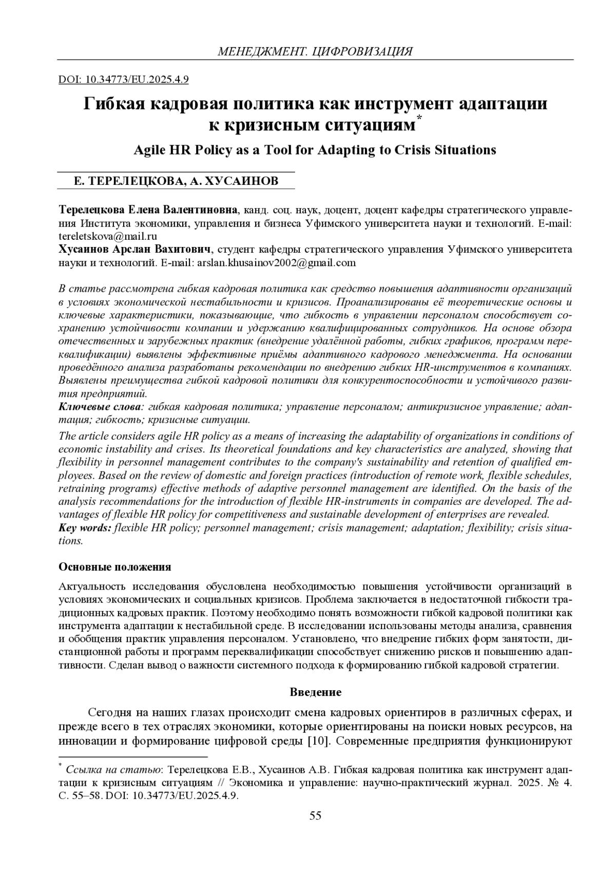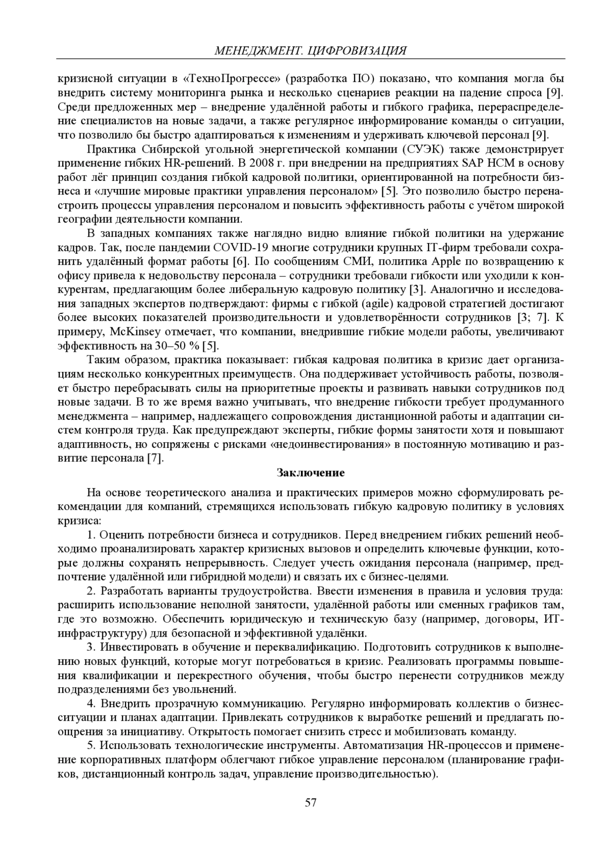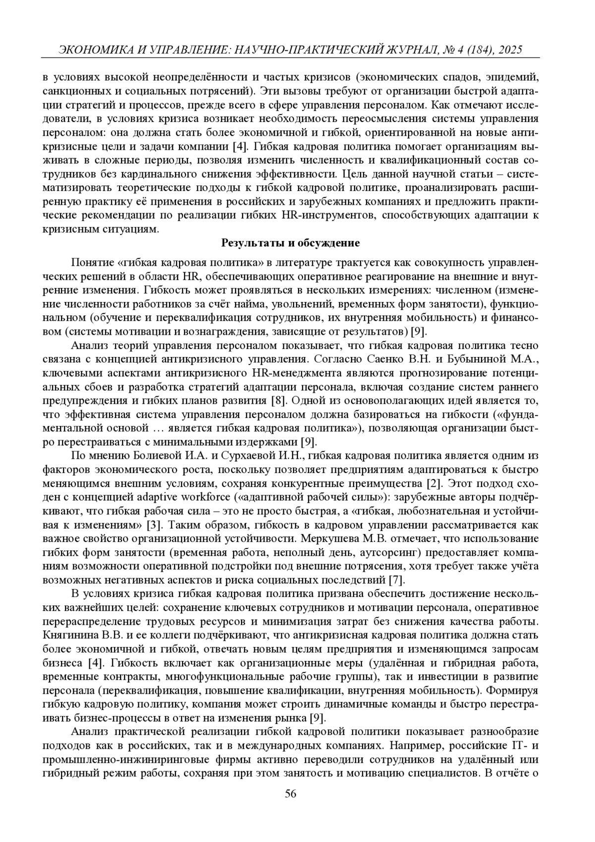 Сегодня на наших глазах происходит смена кадровых ориентиров в различных сферах, и прежде всего в тех отраслях экономики, которые ориентированы на поиски новых ресурсов, на инновации и формирование цифровой среды [10]. Современные предприятия функционируют в условиях высокой неопределённости и частых кризисов (экономических спадов, эпидемий, санкционных и социальных потрясений). Эти вызовы требуют от организации быстрой адаптации стратегий и процессов, прежде всего в сфере управления персоналом. Как отмечают исследователи, в условиях кризиса возникает необходимость переосмысления системы управления персоналом: она должна стать более экономичной и гибкой, ориентированной на новые антикризисные цели и задачи компании [4]. Гибкая кадровая политика помогает организациям выживать в сложные периоды, позволяя изменить численность и квалификационный состав сотрудников без кардинального снижения эффективности. Цель данной научной статьи – систематизировать теоретические подходы к гибкой кадровой политике, проанализировать расширенную практику её применения в российских и зарубежных компаниях и предложить практические рекомендации по реализации гибких HR-инструментов, способствующих адаптации к кризисным ситуациям