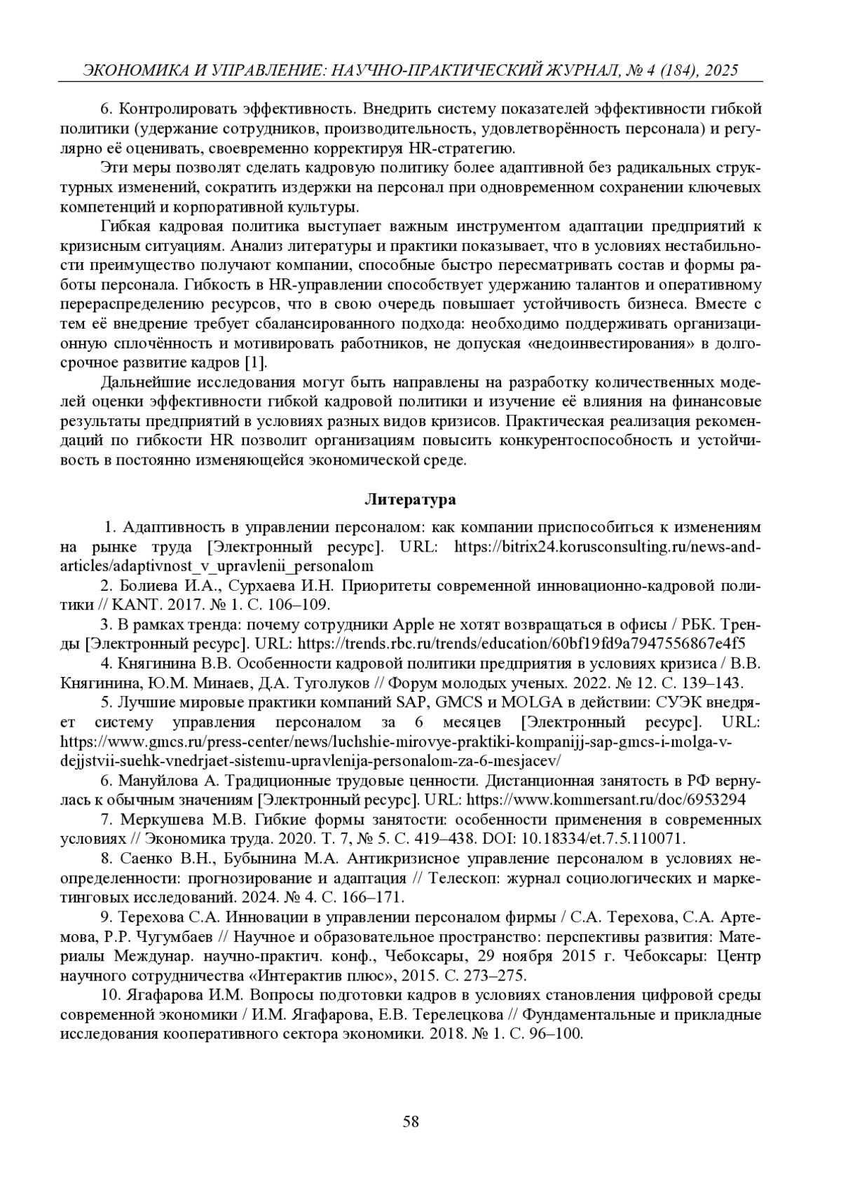8. 	Саенко В.Н., Бубынина М.А. Антикризисное управление персоналом в условиях неопределенности: прогнозирование и адаптация // Телескоп: журнал социологических и маркетинговых исследований. 2024. № 4. С. 166-171.