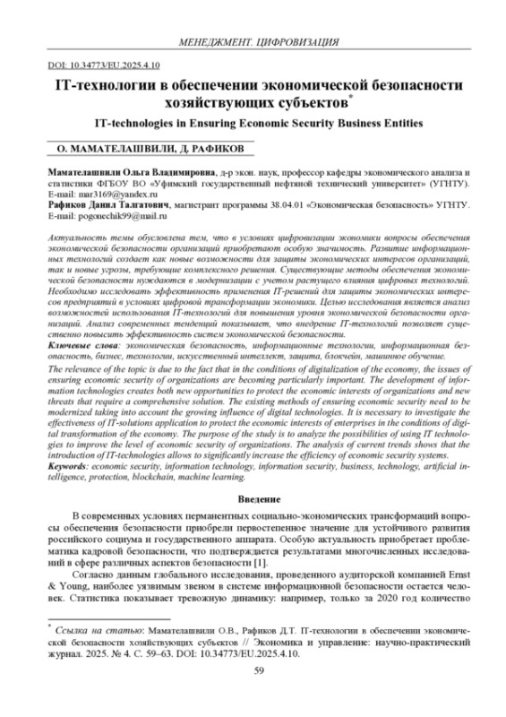 Актуальность темы обусловлена тем, что в условиях цифровизации экономики вопросы обеспечения экономической безопасности организаций приобретают особую значимость. Развитие информационных технологий создает как новые возможности для защиты экономических интересов организаций, так и новые угрозы, требующие комплексного решения. Существующие методы обеспечения экономической безопасности нуждаются в модернизации с учетом растущего влияния цифровых технологий. Необходимо исследовать эффективность применения IT-решений для защиты экономических интересов предприятий в условиях цифровой трансформации экономики. Целью исследования является анализ возможностей использования IT-технологий для повышения уровня экономической безопасности организаций. Анализ современных тенденций показывает, что внедрение IT-технологий позволяет существенно повысить эффективность систем экономической безопасности