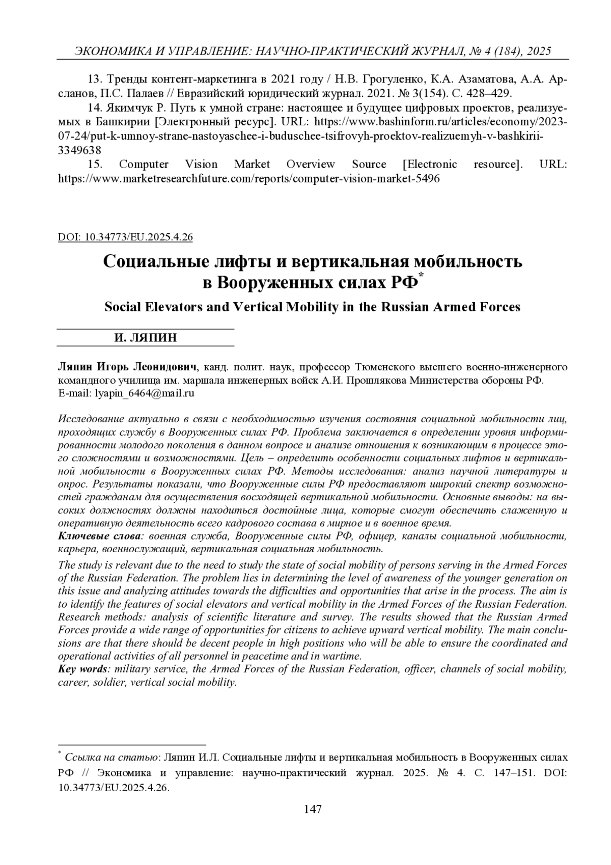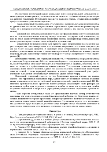 4. 	Смирнов Н. Н. Карьера офицера как форма социальной мобильности в Вооруженных силах Российской Федерации: социально-исторический аспект // Вестник Майкопского государственного технологического университета. 2022. Т. 14, № 3. С. 144-150. EDN: TIGEXD