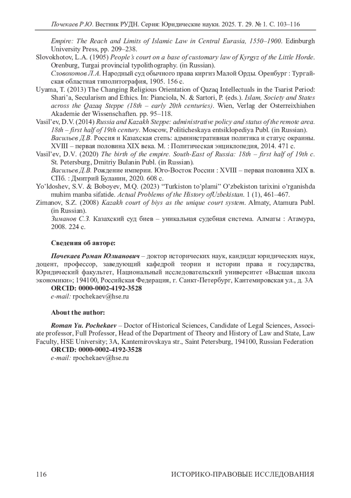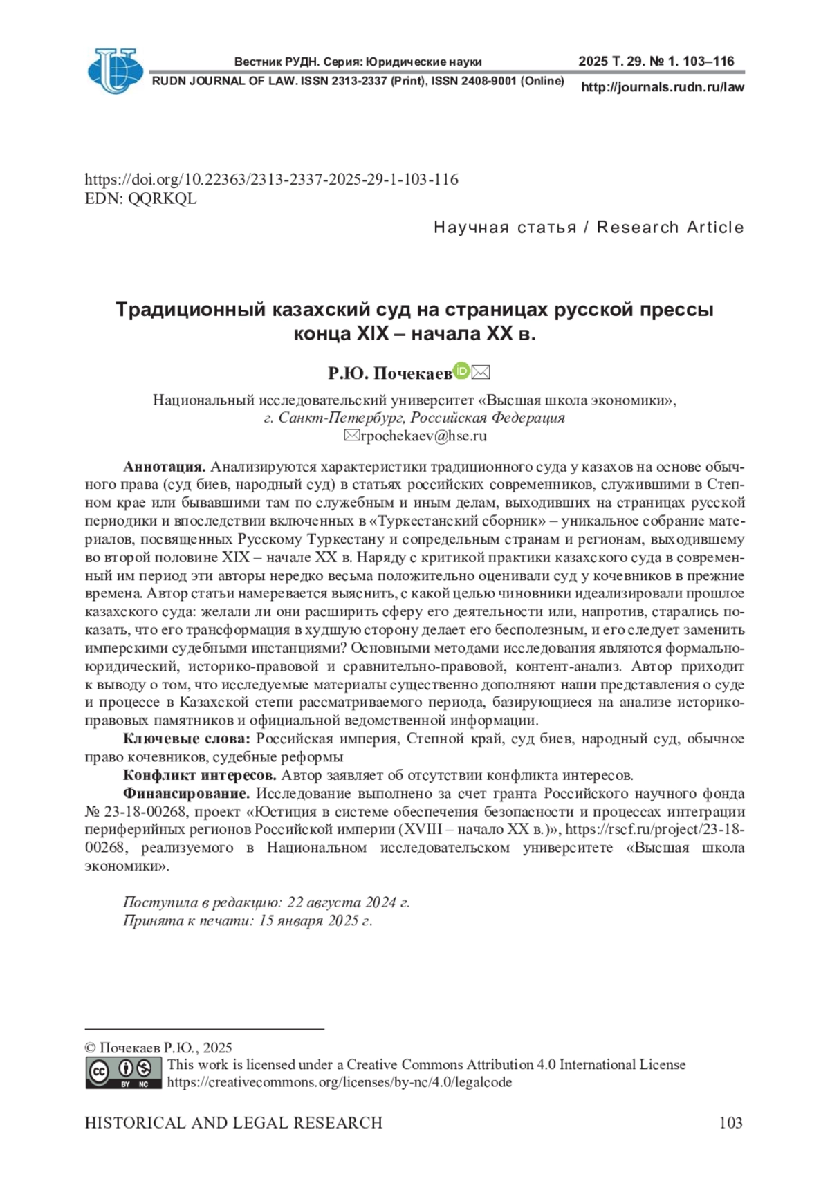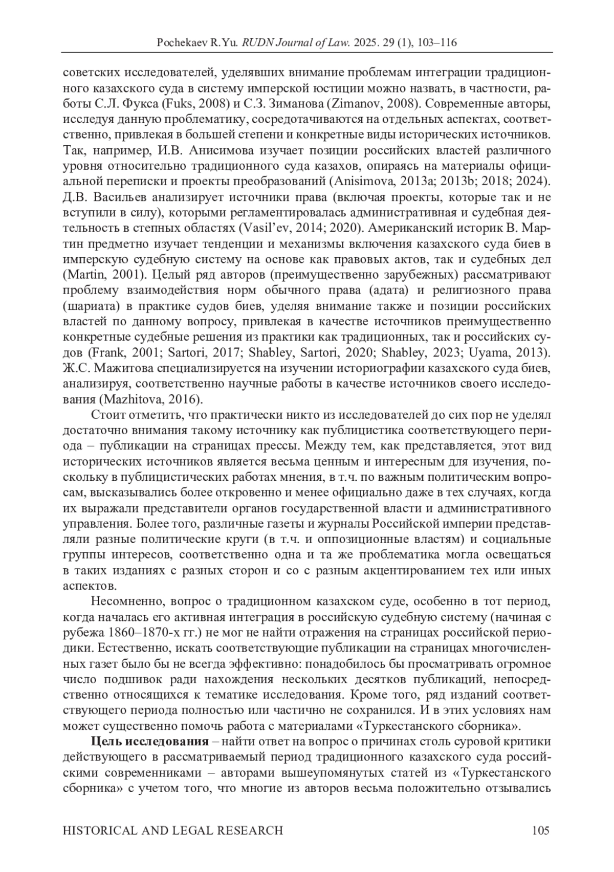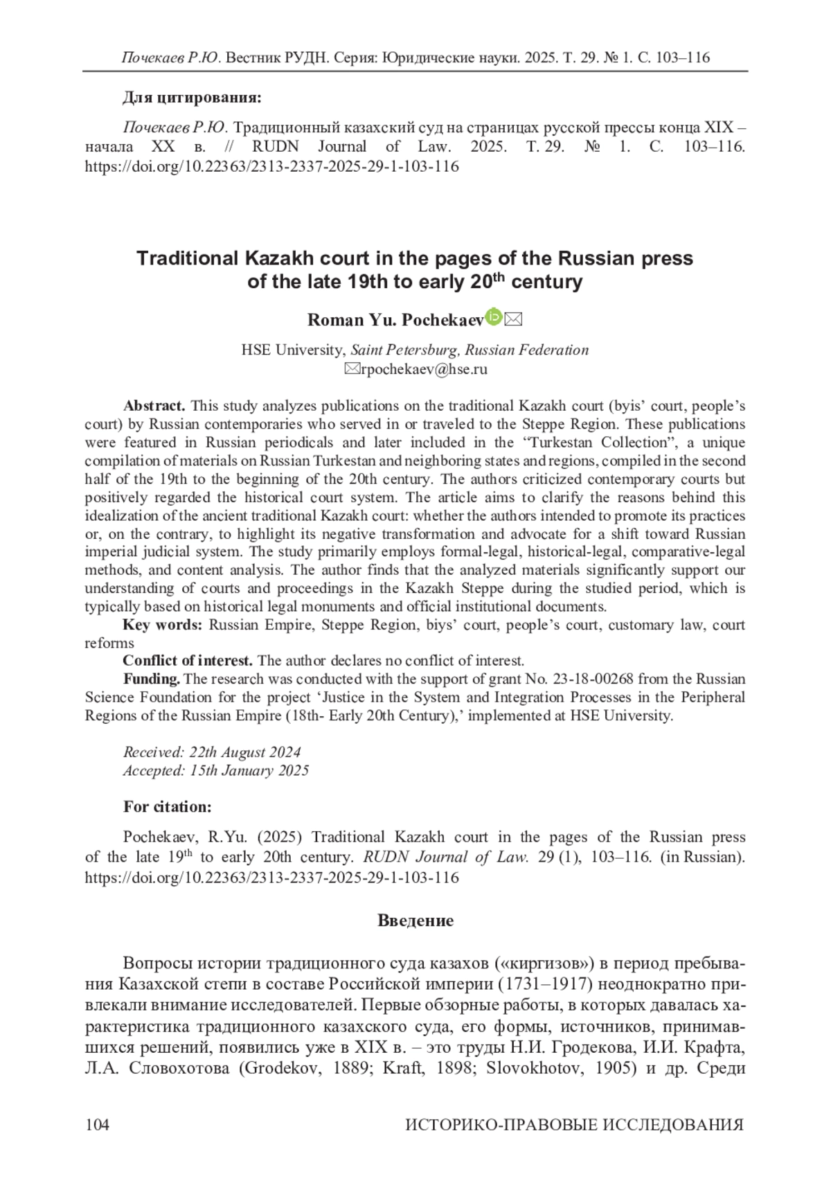 Вопросы истории традиционного суда казахов («киргизов») в период пребывания Казахской степи в составе Российской империи (1731–1917) неоднократно привлекали внимание исследователей. Первые обзорные работы, в которых давалась характеристика традиционного казахского суда, его формы, источников, принимавшихся решений, появились уже в XIX в. – это труды Н. И. Гродекова, И. И. Крафта, Л. А. Словохотова (Grodekov, 1889; Kraft, 1898; Slovokhotov, 1905) и др.