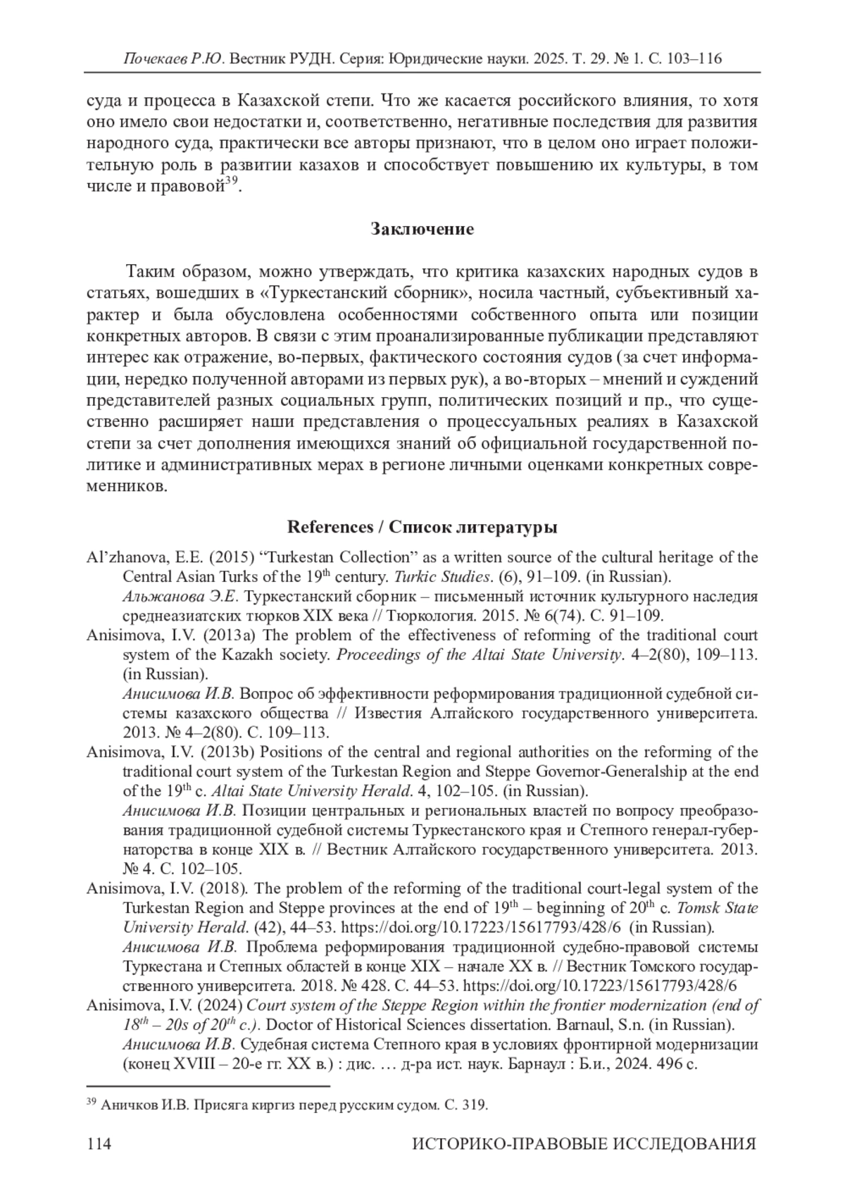 4. 	Анисимова И.В. Проблема реформирования традиционной судебно-правовой системы Туркестана и Степных областей в конце XIX - начале XX в. // Вестник Томского государственного университета. 2018. № 428. С. 44-53. DOI: 10.17223/15617793/428/6