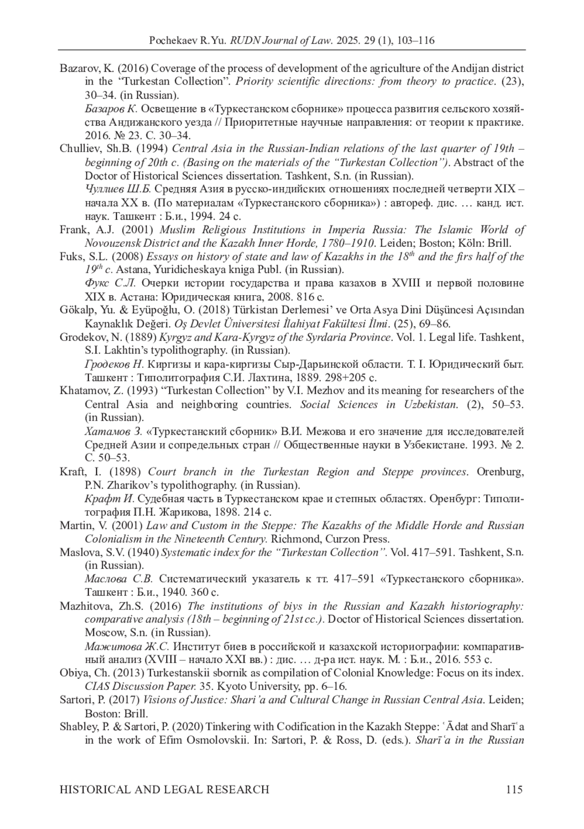 6. 	Базаров К. Освещение в “Туркестанском сборнике” процесса развития сельского хозяйства Андижанского уезда // Приоритетные научные направления: от теории к практике. 2016. № 23. С. 30-34. EDN: VPVAZH