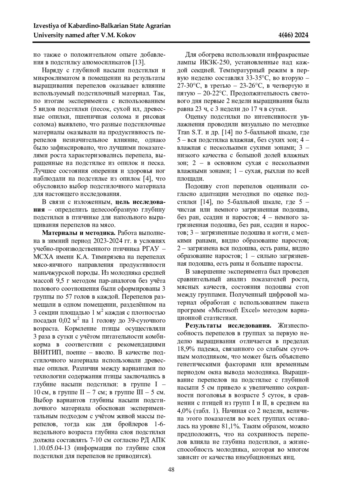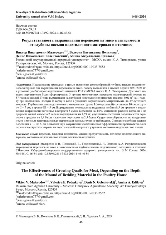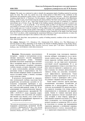 Исследование проводили с целью выявления целесообразной глубины насыпи подстилочного материала для выращивания перепелов на мясо. Работу выполняли в зимний период 2023-2024 гг. в условиях учебно-производственного птичника РГАУ-МСХА имени К. А. Тимирязева. Для этого методом пар-аналогов были сформированы 3 группы мясо-яичных перепелов маньчжурской породы по 57 голов в каждой. Птицу выращивали на глубокой подстилке с плотностью посадки 0,02 м2 на 1 голову при постоянном доступе к корму и воде в условиях нормативного микроклимата до 39-суточного возраста. Глубина насыпи подстилочного материала в группе I (контрольной) составляла 10 см; в группе II - 7 см; в группе III - 5 см. Выращивание перепелов на подстилке глубиной 5 см привело к увеличению сохранности поголовья в возрасте 5 суток в среднем на 4,0%; снижению расхода корма на 1 кг прироста живой массы за 2 недели выращивания на 1,59 кг; улучшению состояния подошвы стоп перепелов в среднем на 1,4 балла и качества подстилки на 2,5 балла. Существенной разности по продуктивности и мясным качествам между перепелами разных групп не наблюдали. Снижение глубины насыпи подстилки с 10 до 5 см позволяет при сохранении зоотехнической эффективности производства мяса перепелов сократить затраты на подстилочный материал и улучшить состояние подошвы стоп птицы.