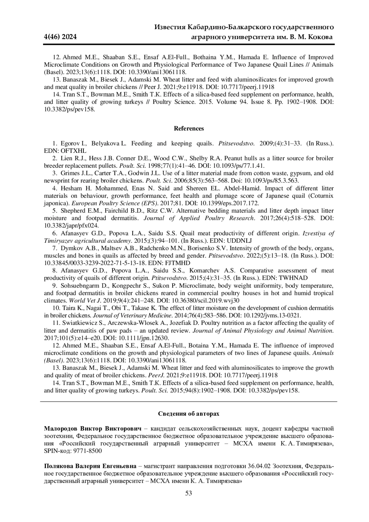 12. 	Ahmed M.E., Shaaban S.E., Ensaf A.El-Full., Bothaina Y.M., Hamada E. Influence of Improved Microclimate Conditions on Growth and Physiological Performance of Two Japanese Quail Lines // Animals (Basel). 2023;13(6):1118. DOI: 10.3390/ani13061118 EDN: ZVSMZS