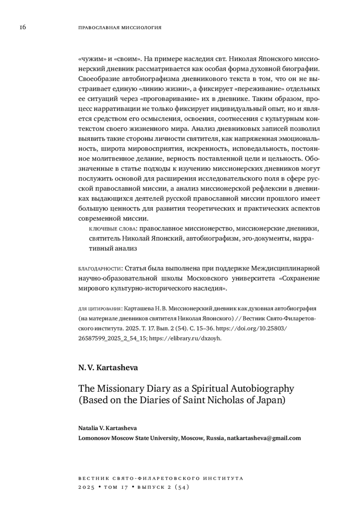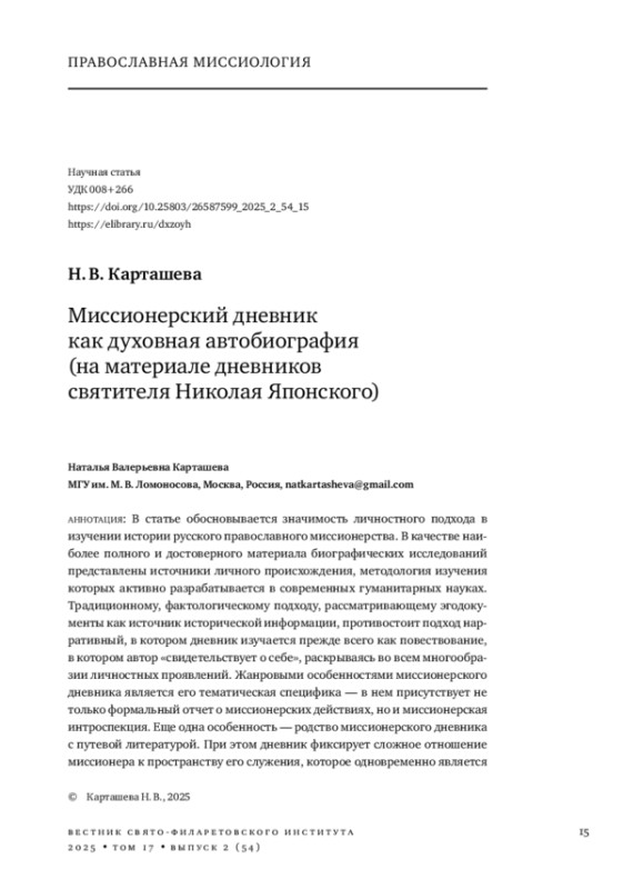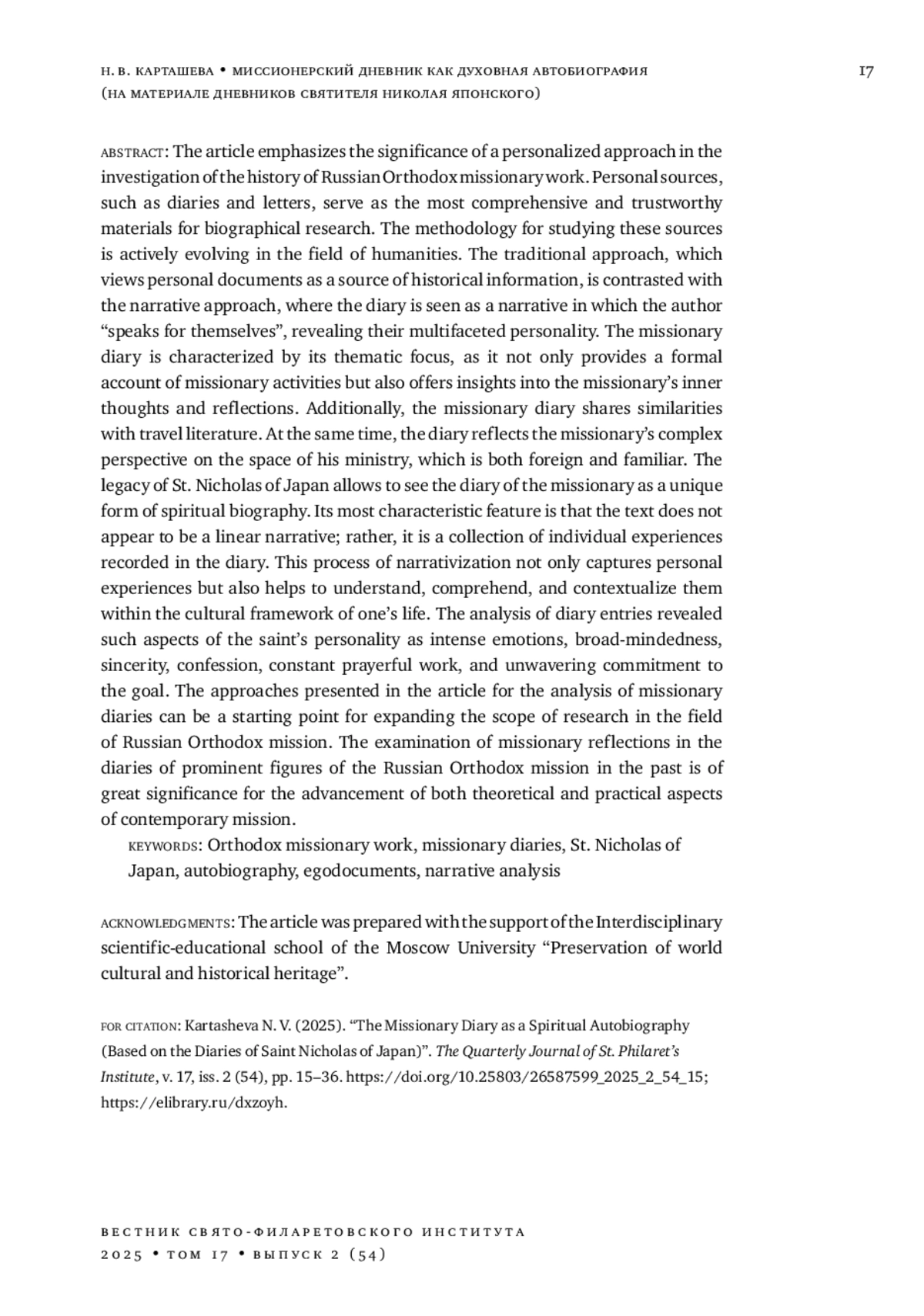 В статье обосновывается значимость личностного подхода в изу чении истории русского православного миссионерства. В качестве наиболее полного и достоверного материала биографических исследований представлены источники личного происхождения, методология изучения которых активно разрабатывается в современных гуманитарных науках. Традиционному, фактологическому подходу, рассматривающему эгодокументы как источник исторической информации, противостоит подход нарративный, в котором дневник изучается прежде всего как повествование, в котором автор «свидетельствует о себе», раскрываясь во всем многообразии личностных проявлений. Жанровыми особенностями миссионерского дневника является его тематическая специфика - в нем присутствует не только формальный отчет о миссионерских действиях, но и миссионерская интроспекция. Еще одна особенность - родство миссионерского дневника с путевой литературой. При этом дневник фиксирует сложное отношение миссионера к пространству его служения, которое одновременно является «чужим» и «своим». На примере наследия свт. Николая Японского миссионерский дневник рассматривается как особая форма духовной биографии. Своеобразие автобиографизма дневникового текста в том, что он не выстраивает единую «линию жизни», а фиксирует «переживание» отдельных ее ситуаций через «проговаривание» их в дневнике. Таким образом, процесс нарративации не только фиксирует индивидуальный опыт, но и является средством его осмысления, освоения, соотнесения с культурным контекстом своего жизненного мира. Анализ дневниковых записей позволил выявить такие стороны личности святителя, как напряженная эмоциональность, широта мировосприятия, искренность, исповедальность, постоянное молитвенное делание, верность поставленной цели и цельность. Обозначенные в статье подходы к изучению миссионерских дневников могут послужить основой для расширения исследовательского поля в сфере русской православной миссии, а анализ миссионерской рефлексии в дневниках выдающихся деятелей русской православной миссии прошлого имеет большую ценность для развития теоретических и практических аспектов современной миссии.