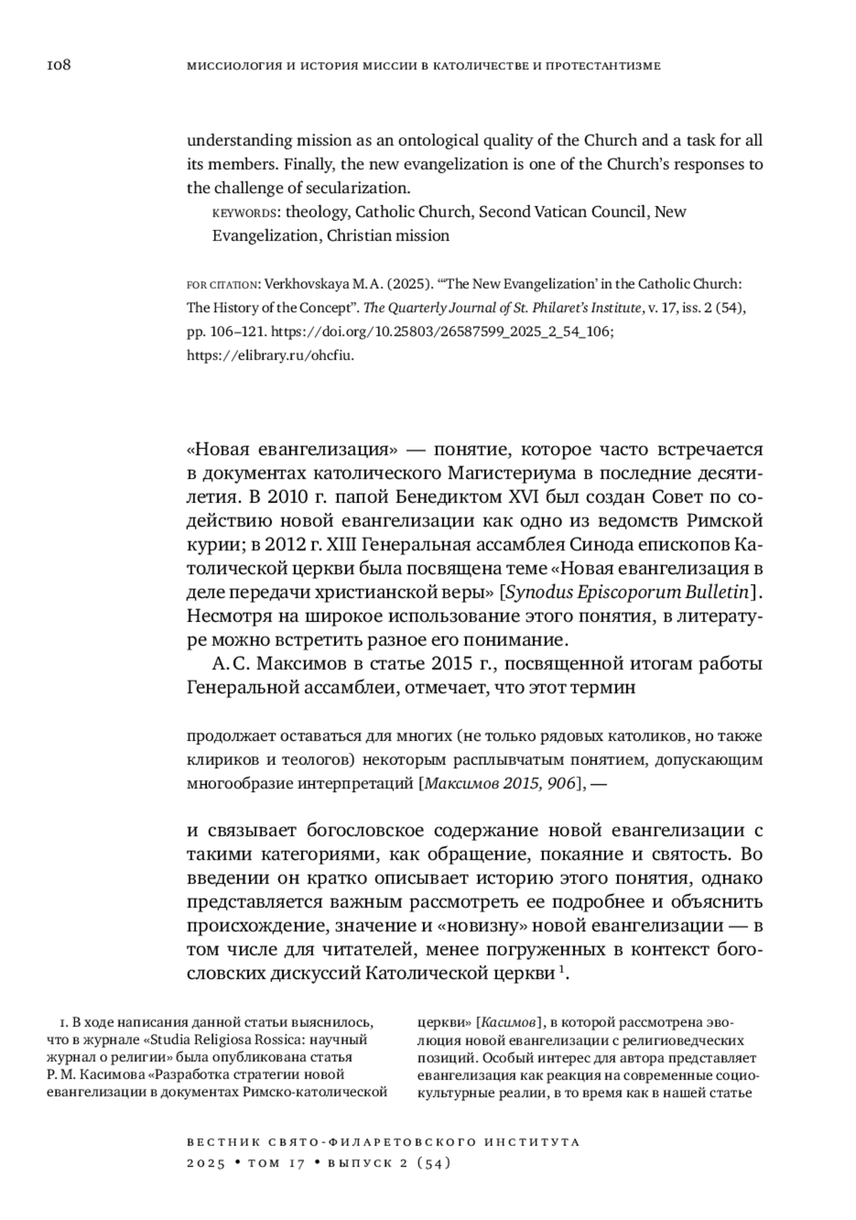 16. 	Касимов Р. М. Разработка стратегии новой евангелизации в документах Римско-католической церкви // Studia Religiosa Rossica: научный журнал о религии. 2025. N. 1. С. 137-150. DOI: 10.28995/2658-4158-2025-1-137-150 EDN: HEKAIT