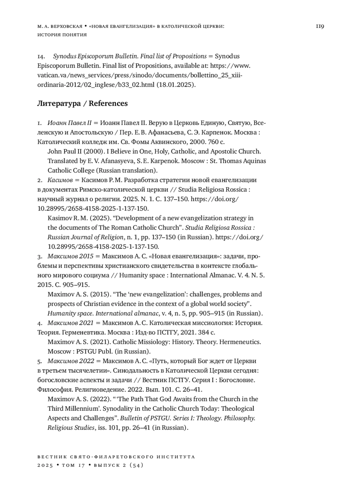 19. 	Максимов А. С. “Путь, который Бог ждет от Церкви в третьем тысячелетии”. Cинодальность в Католической Церкви сегодня: богословские аспекты и задачи // Вестник ПСТГУ. Серия I: Богословие. Философия. Религиоведение. 2022. Вып. 101. С. 26-41. DOI: 10.15382/sturI2022101.26-41