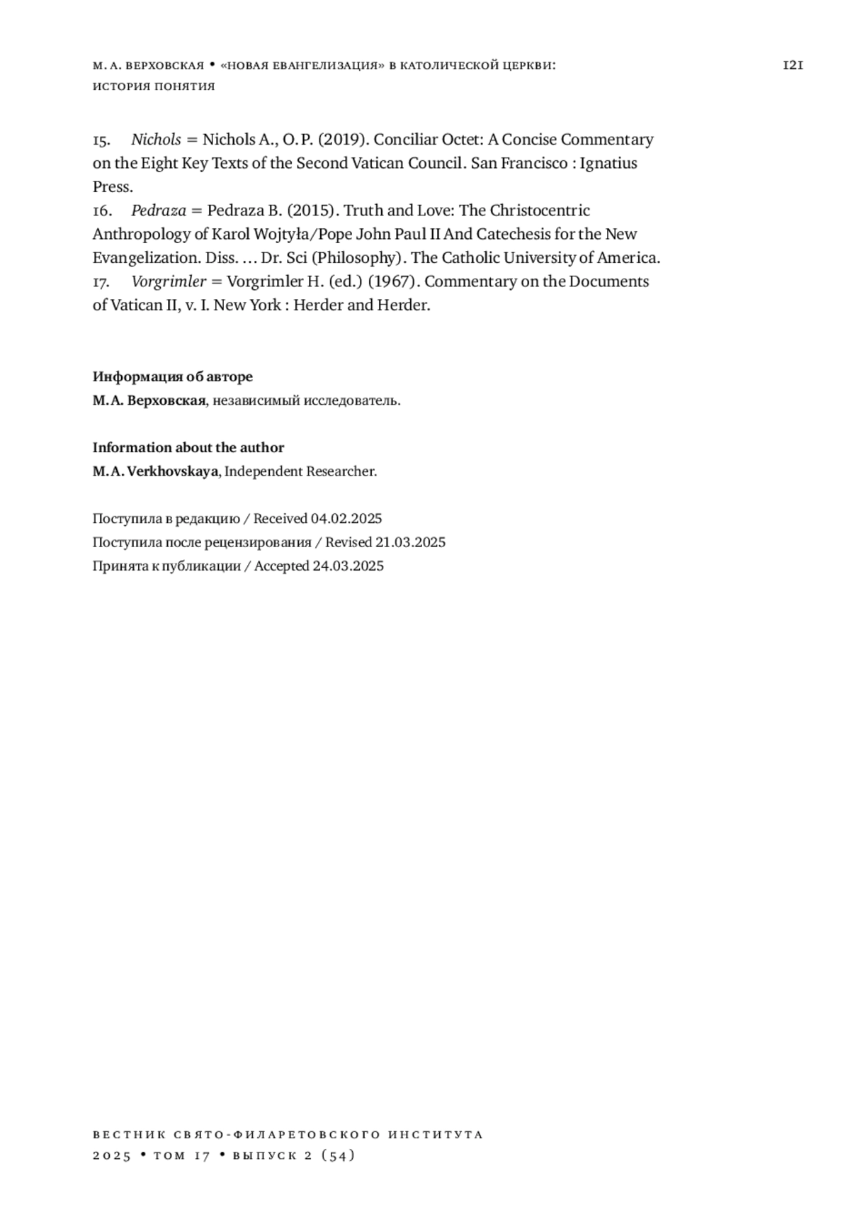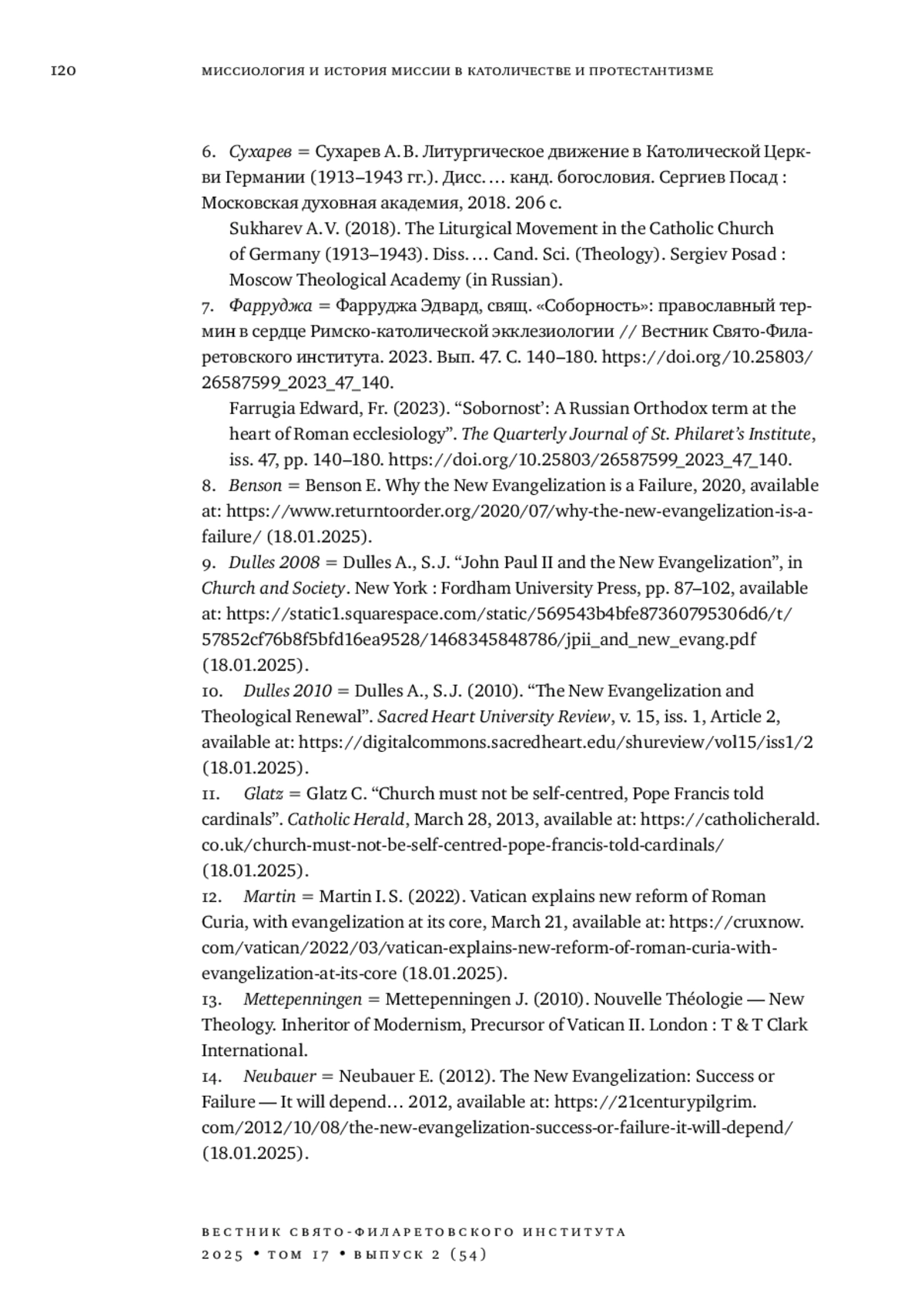 21. 	Фарруджа Эдвард, свящ. “Соборность”: православный термин в сердце Римско-католической экклезиологии // Вестник Свято-Филаретовского института. 2023. Вып. 47. С. 140-180. DOI: 10.25803/26587599_2023_47_140 EDN: LUDDWQ