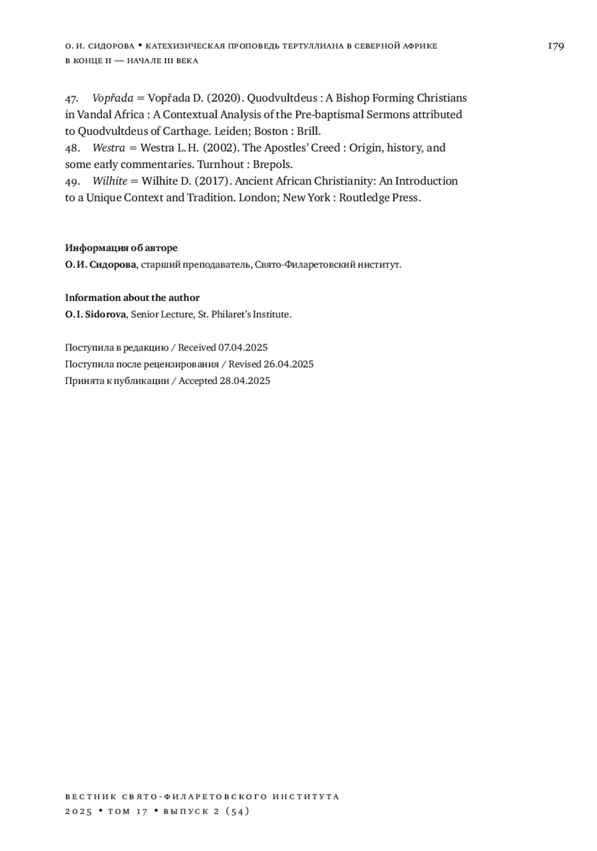 47. 	Vopřada D. (2020). Quodvultdeus: A Bishop Forming Christians in Vandal Africa: A Contextual Analysis of the Pre-baptismal Sermons attributed to Quodvultdeus of Carthage. Leiden; Boston: Brill.