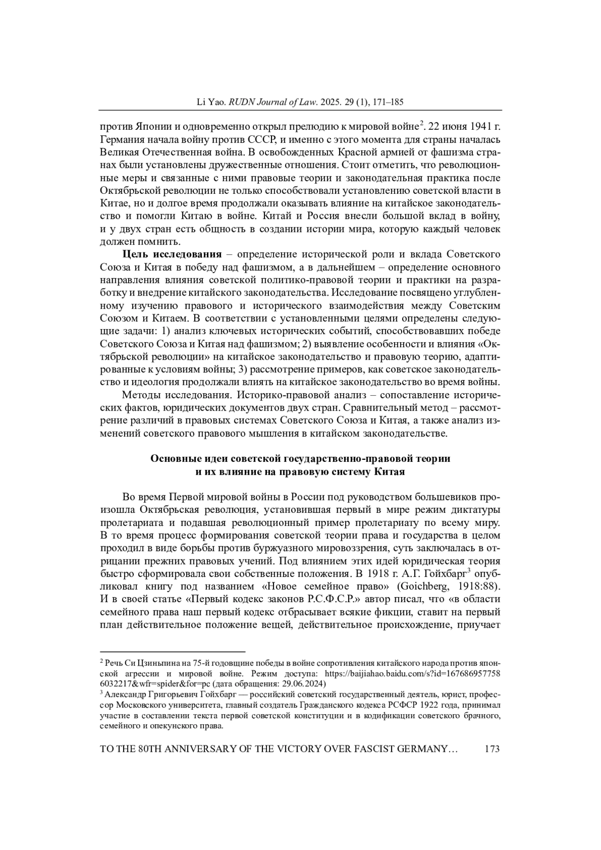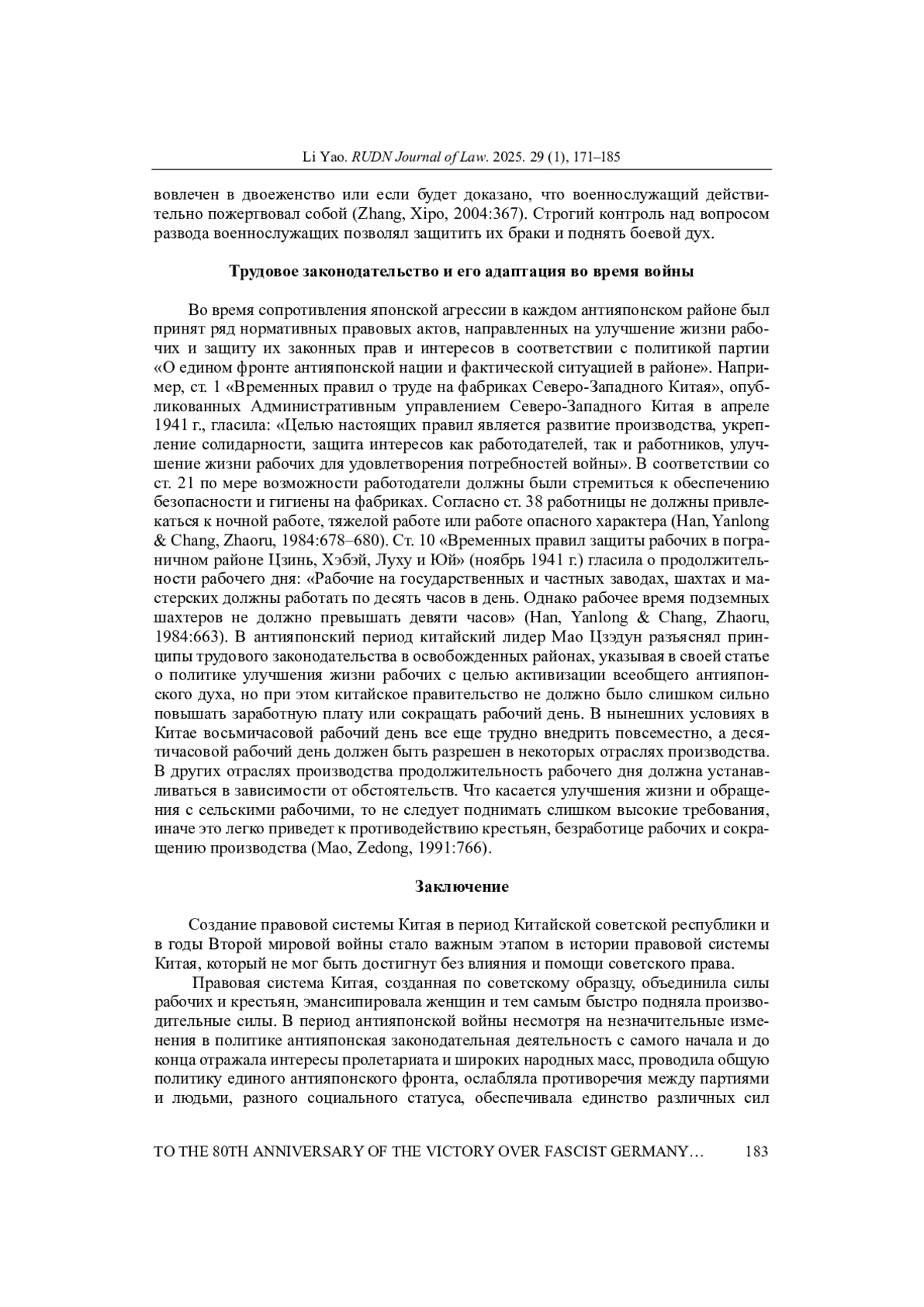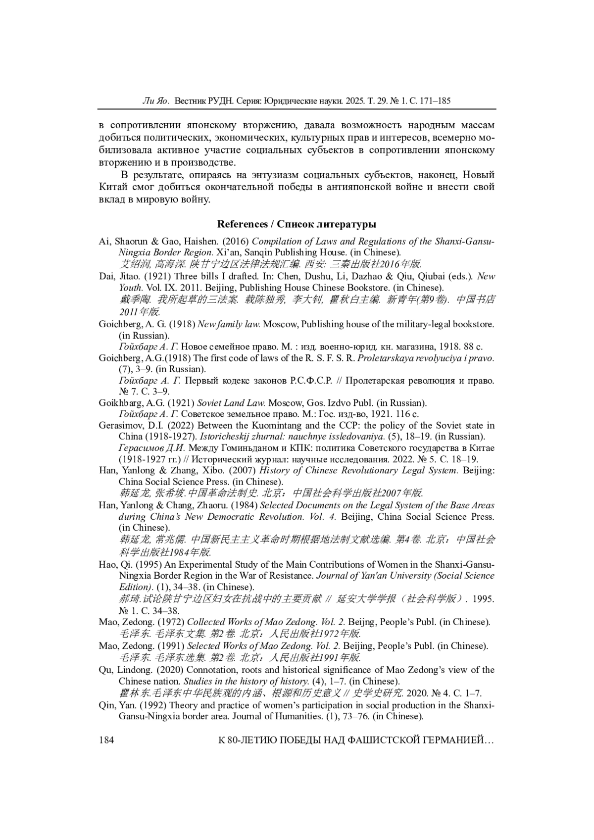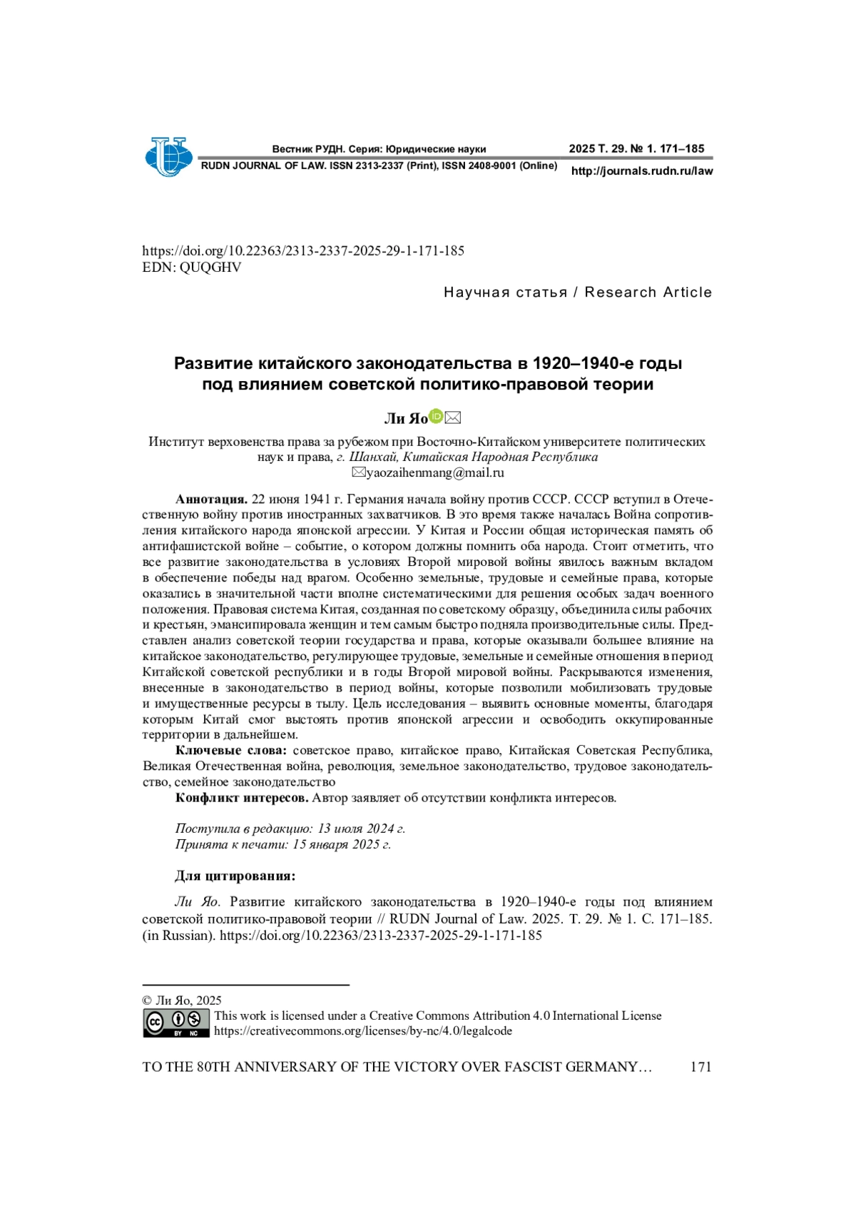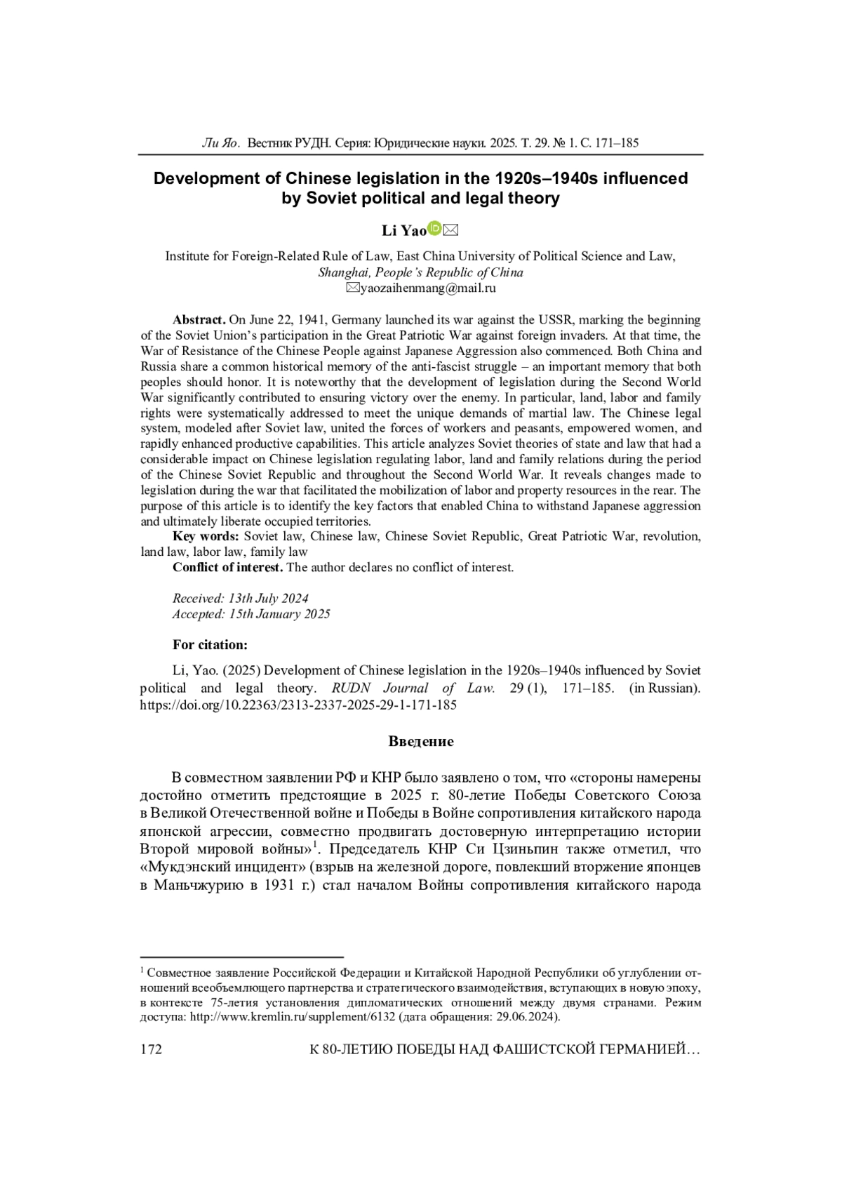 ЛИ Я. РАЗВИТИЕ КИТАЙСКОГО ЗАКОНОДАТЕЛЬСТВА В 1920-1940-Е ГОДЫ ПОД ВЛИЯНИЕМ СОВЕТСКОЙ ПОЛИТИКО-ПРАВОВОЙ ТЕОРИИ // ВЕСТНИК РОССИЙСКОГО УНИВЕРСИТЕТА ДРУЖБЫ НАРОДОВ. СЕРИЯ: ЮРИДИЧЕСКИЕ НАУКИ. 2025. Т. 29 № 1