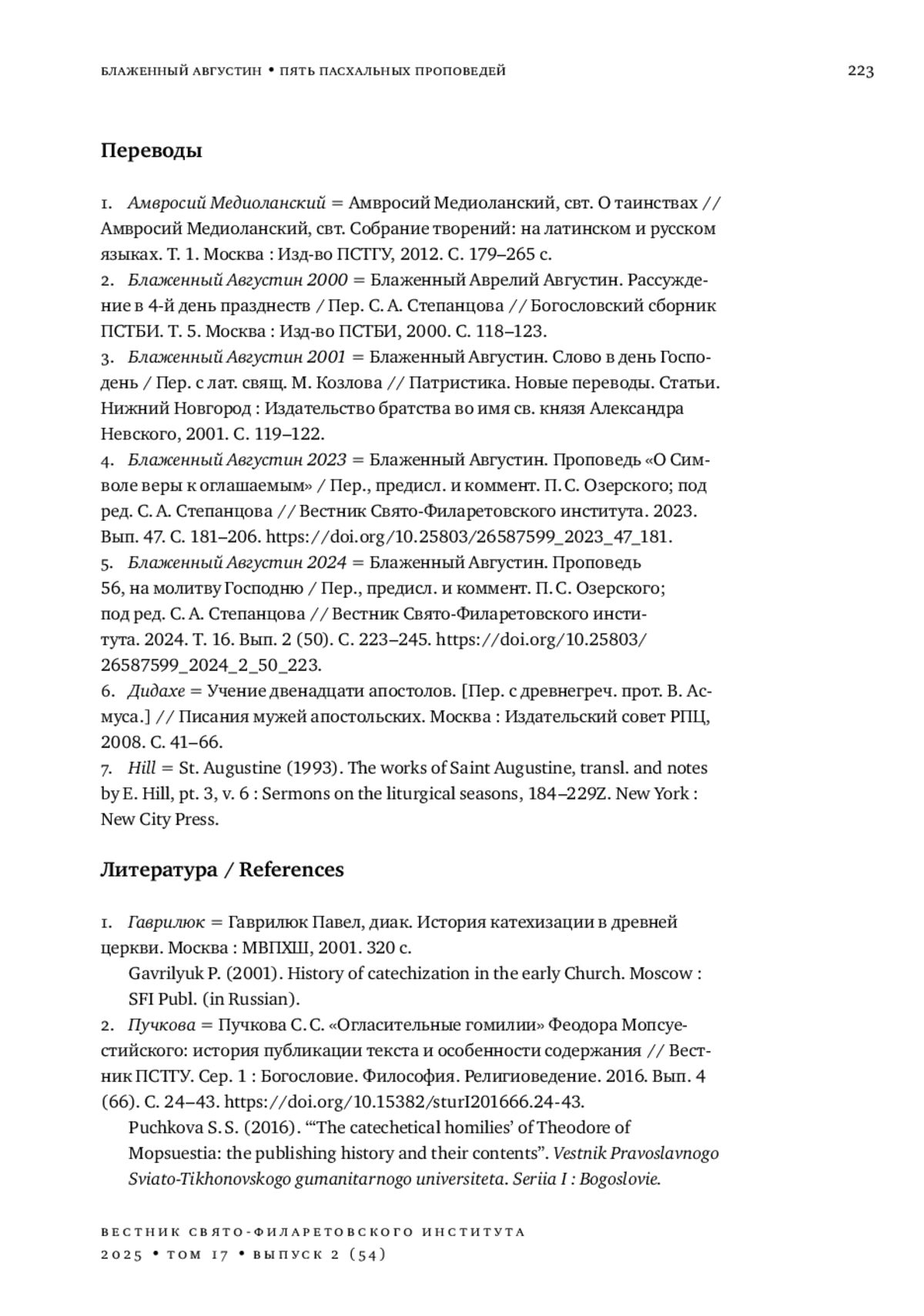 2. 	Пучкова С. С. “Огласительные гомилии” Феодора Мопсуестийского: история публикации текста и особенности содержания // Вестник ПСТГУ. Сер. 1: Богословие. Философия. Религиоведение. 2016. Вып. 4 (66). С. 24-43. DOI: 10.15382/sturI201666.24-43 EDN: WJBHOL