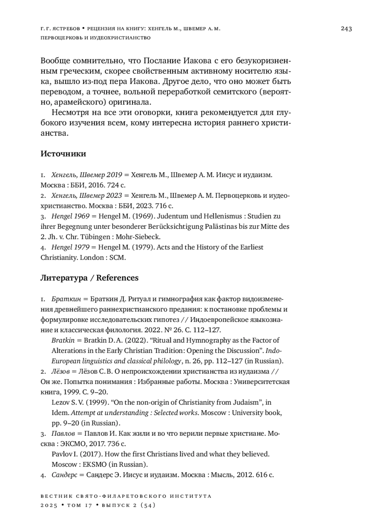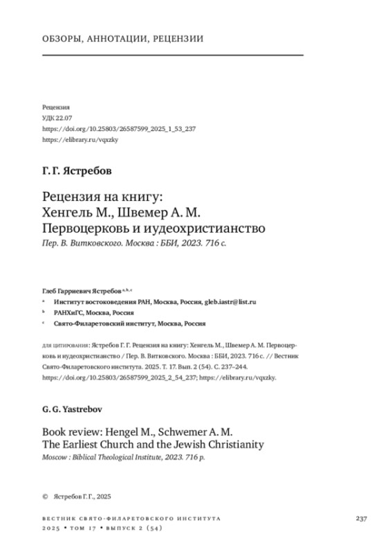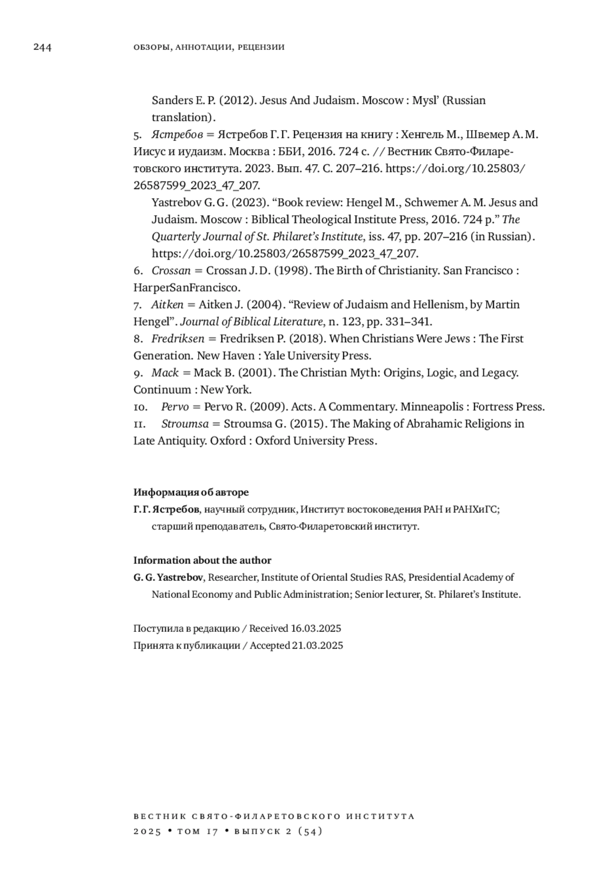 9. 	Ястребов Г. Г. Рецензия на книгу: Хенгель М., Швемер А. М. Иисус и иудаизм. Москва: ББИ, 2016. 724 с. // Вестник Свято-Филаретовского института. 2023. Вып. 47. С. 207-216. 10.25803/ 26587599_2023_47_207. DOI: 10.25803/26587599_2023_47_207 EDN: EFGMRW