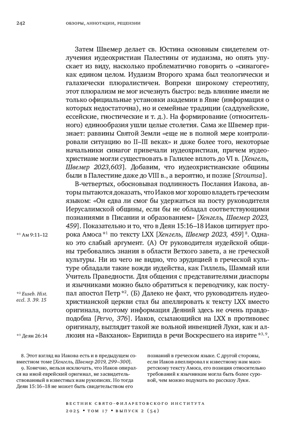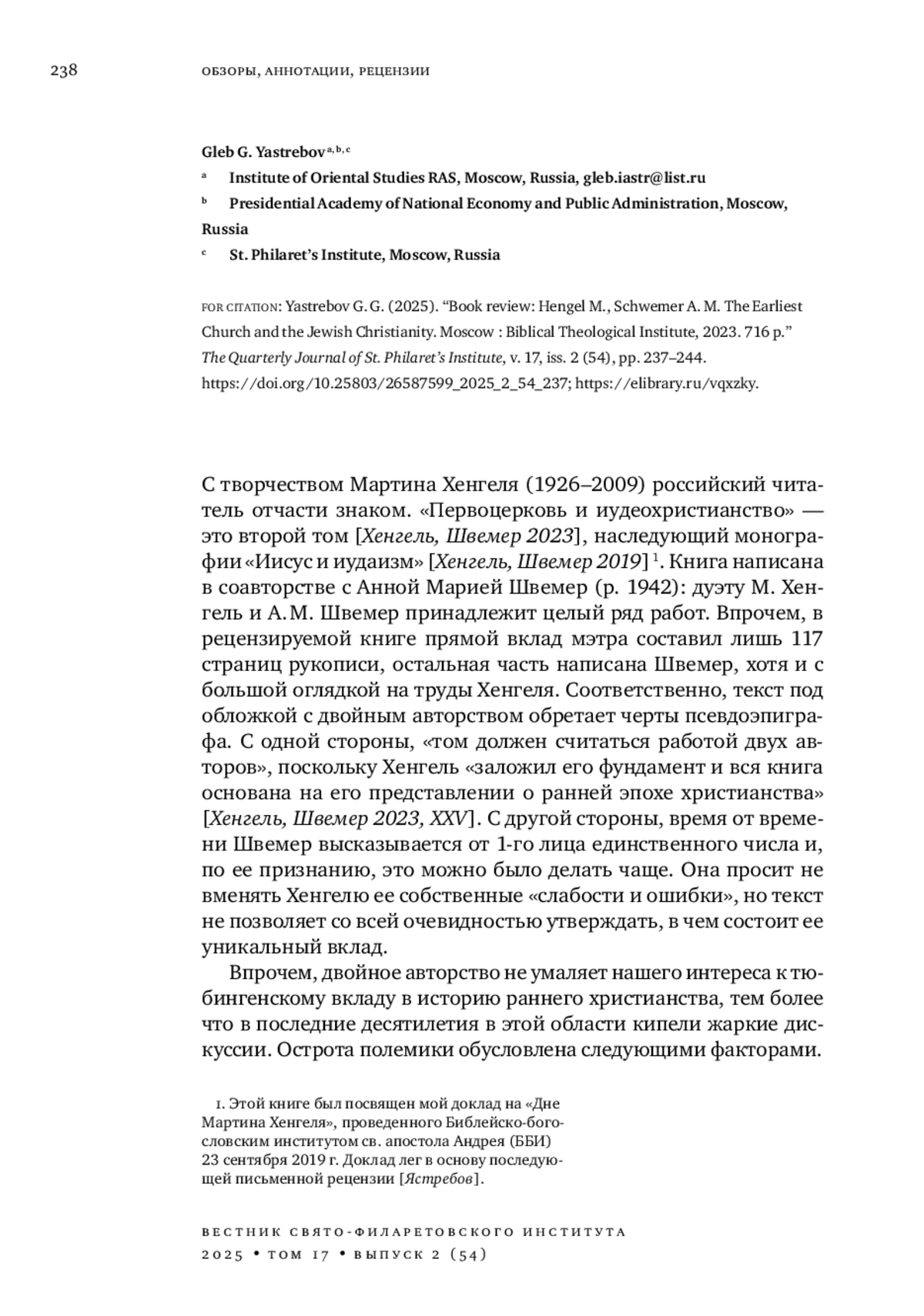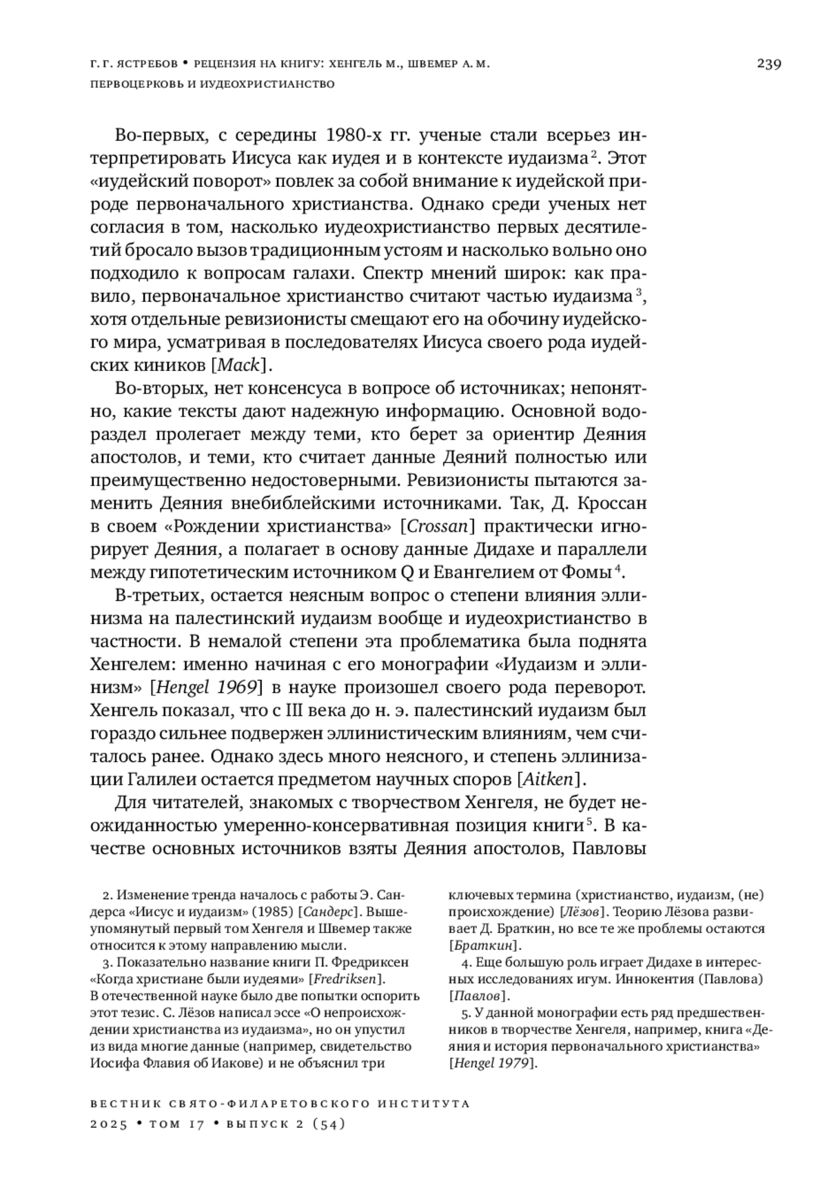 9. 	Ястребов Г. Г. Рецензия на книгу: Хенгель М., Швемер А. М. Иисус и иудаизм. Москва: ББИ, 2016. 724 с. // Вестник Свято-Филаретовского института. 2023. Вып. 47. С. 207-216. 10.25803/ 26587599_2023_47_207. DOI: 10.25803/26587599_2023_47_207 EDN: EFGMRW