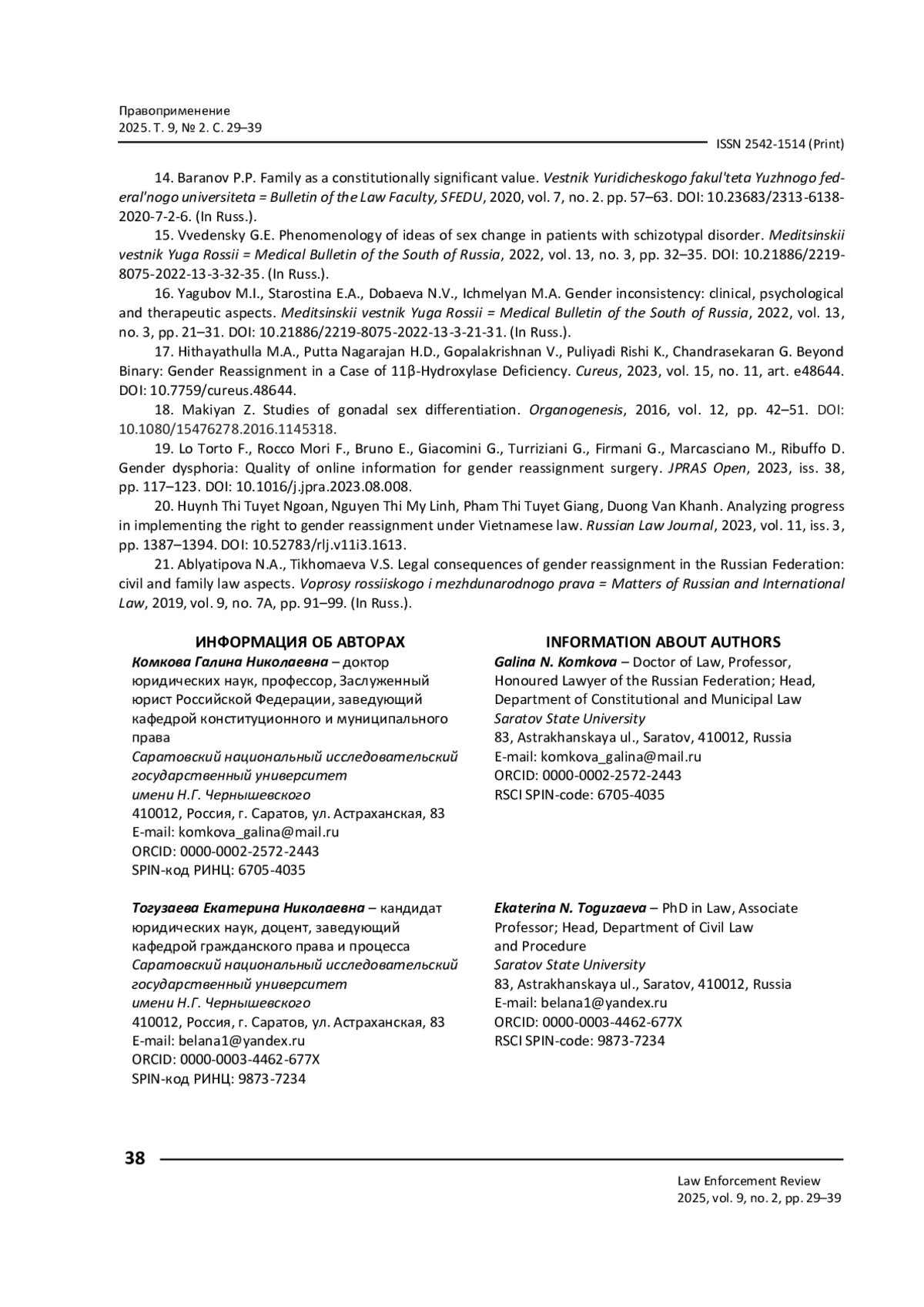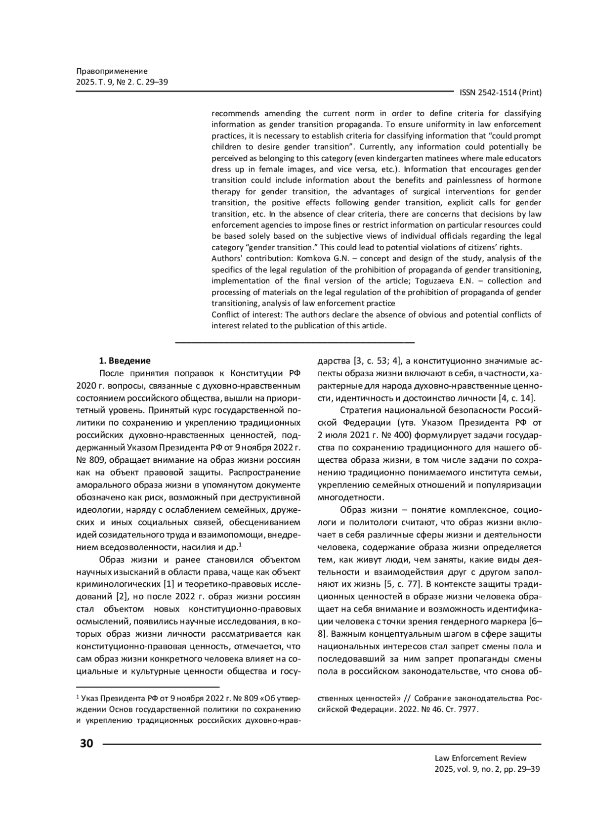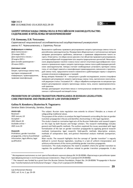 КОМКОВА Г. Н., ТОГУЗАЕВА Е. Н. ЗАПРЕТ ПРОПАГАНДЫ СМЕНЫ ПОЛА В РОССИЙСКОМ ЗАКОНОДАТЕЛЬСТВЕ: СОДЕРЖАНИЕ И ПРОБЛЕМЫ ПРАВОПРИМЕНЕНИЯ // ПРАВОПРИМЕНЕНИЕ. 2025. ТОМ 9, № 2