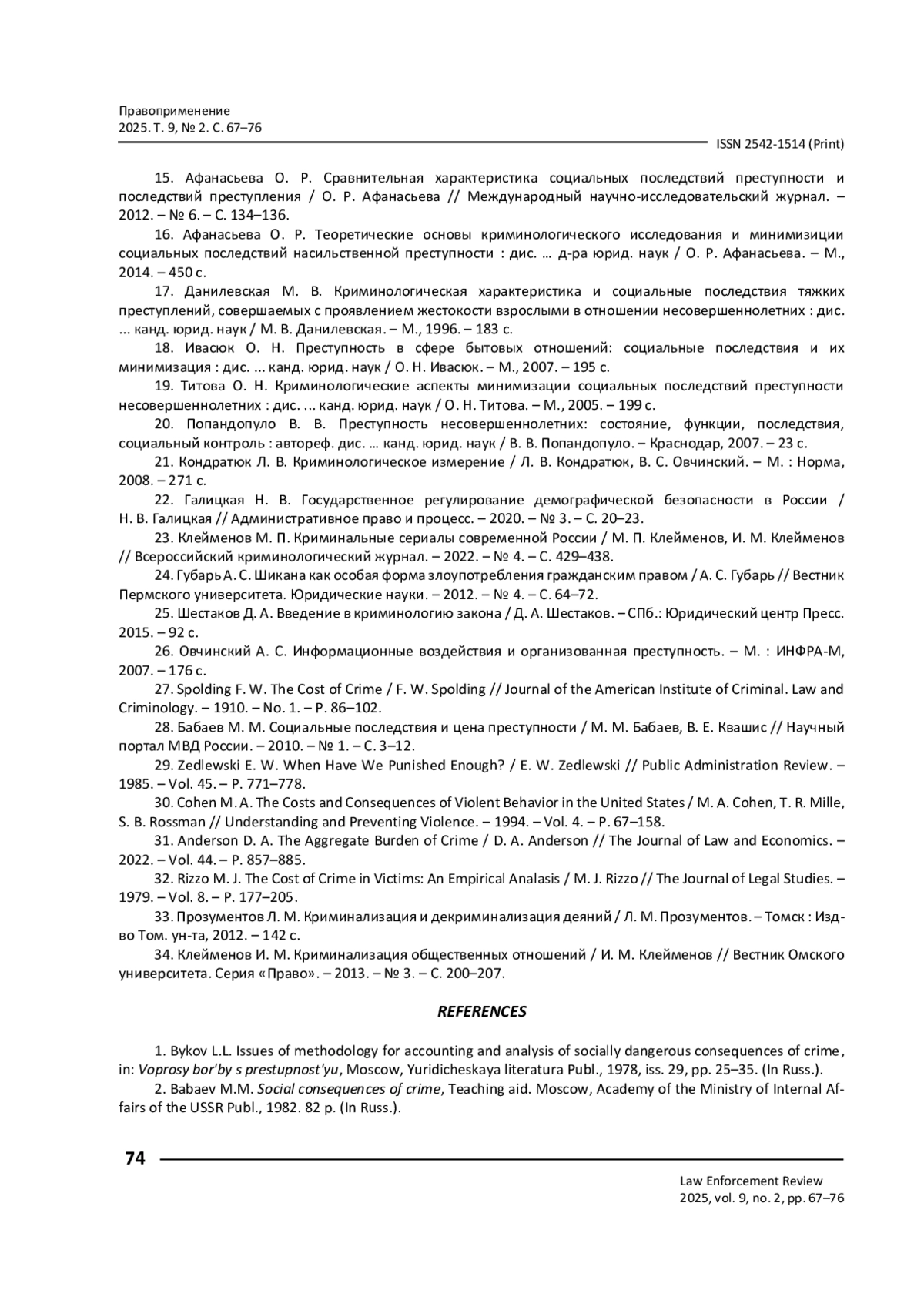28. Бабаев М. М. Социальные последствия и цена преступности / М. М. Бабаев, В. Е. Квашис // Научный портал МВД России. - 2010. - № 1. - С. 3-12.