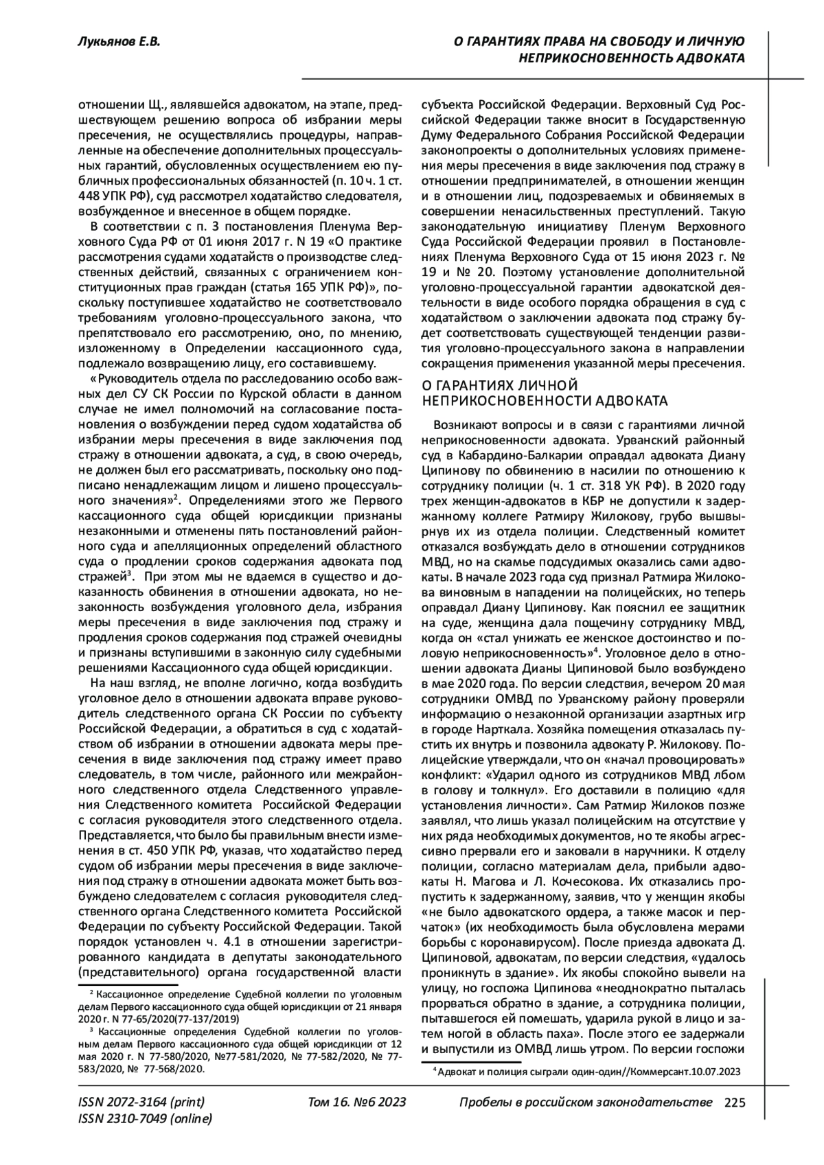 Возникают вопросы и в связи с гарантиями личной неприкосновенности адвоката. Урванский районный суд в Кабардино-Балкарии оправдал адвоката Диану Ципинову по обвинению в насилии по отношению к сотруднику полиции (ч. 1 ст. 318 УК РФ). В 2020 году трех женщин-адвокатов в КБР не допустили к задержанному коллеге Ратмиру Жилокову, грубо вышвырнув их из отдела полиции. Следственный комитет отказался возбуждать дело в отношении сотрудников МВД, но на скамье подсудимых оказались сами адвокаты. В начале 2023 года суд признал Ратмира Жилокова виновным в нападении на полицейских, но теперь оправдал Диану Ципинову. Как пояснил ее защитник на суде, женщина дала пощечину сотруднику МВД, когда он «стал унижать ее женское достоинство и половую неприкосновенность»4. Уголовное дело в отношении адвоката Дианы Ципиновой было возбуждено в мае 2020 года.