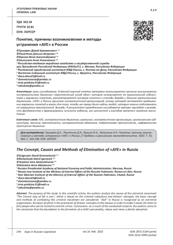 Цель исследования. В данной научной статье авторами анализируются причины возникновения экстремистского движения «Арестантский уклад един» которое основывается на криминальной субкультуре и воровских понятиях, рассматривается основное понятие и способы борьбы с данным криминальным движением. «АУЕ» в России признана экстремистской организацией, основу которой составляет продвижение воровских понятий в массы для того, чтобы им проще было найти людей, которых можно подстрекать на совершение преступлений. Выводы. В результате проведенного исследования авторы приходят к выводу, что фундаментом в формировании личности ребенка, его ценностей и взглядов является семейное воспитание.
