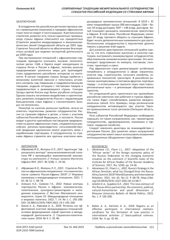 2. Абрамова И.О., Фитуни Л.Л., 2021. Стратегия России на африканском направлении: что изменилось после саммита Россия-Африка 2019? // Мировая экономика и международные отношения. 2021. Т. 65. № 12. С. 68-78. EDN: KYTKPA