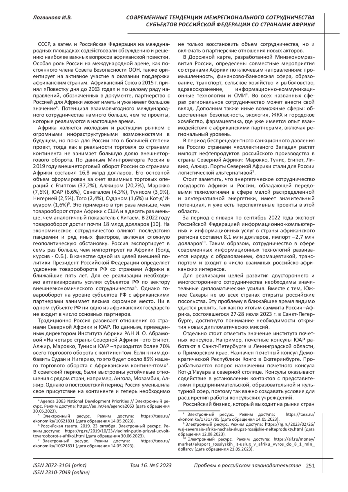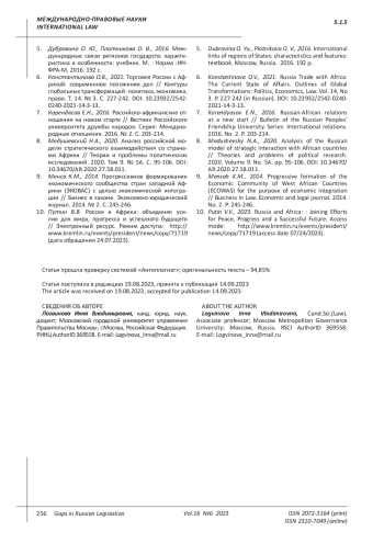 6. Константинова О.В., 2021. Торговля России с Африкой: современное положение дел // Контуры глобальных трансформаций: политика, экономика, право. Т. 14. № 3. С. 227-242. DOI: 10.23932/2542-0240-2021-14-3-13 EDN: GEFUFY