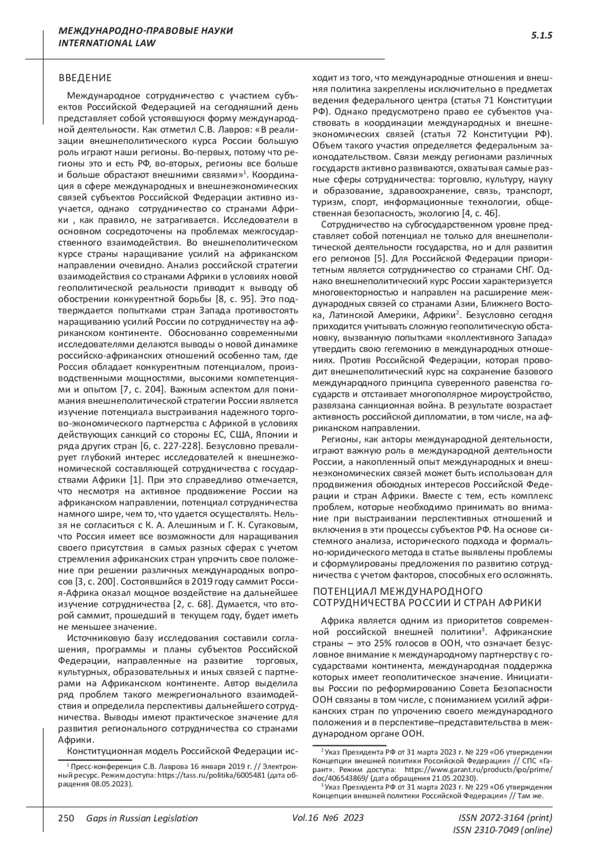 Современная внешняя политика России направлена на выстраивание устойчивого взаимодействия со странами Африки, несмотря на то, что в целом континент не отличается стабильностью. В этой связи важно учитывать потенциал регионального участия в реализации единого внешнеполитического курса страны. Субъекты Российской Федерации могут внести существенный вклад в образовательное, экономическое, культурное сотрудничество, а также взаимодействовать практически по всем социально-гуманитарным и экономическим аспектам со странами Африки. Вместе с тем, есть объективные проблемы в развитии такого регионального взаимодействия. В статье на основе системного и исторического подходов обозначены ряд таких проблем. С позиции формально-юридического анализа российской федеративной модели сформулированы выводы о перспективах сотрудничества субъектов Российской Федерации с африканскими акторами.