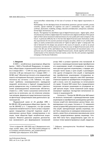 Исследованы особенности правовой регламентации цифровых финансовых активов, выпускаемых для удостоверения требований передачи эмиссионных ценных бумаг российского непубличного акционерного общества. Выявлены чрезмерная громоздкость конструкции цифровых требований – прав на ценные бумаги хозяйственного общества как вида цифровых финансовых активов, а также избыточность процедур выпуска сначала этих активов, затем конвертируемых в акции ценных бумаг, в итоге самих акций непубличного акционерного общества. Вносятся предложения о комплексной корректировке правового регулирования отечественного финансового рынка и цифровых финансовых активов определенных видов. Модернизация регулирования инвестиционных отношений необходима как ключевой элемент создаваемой системы антисанкционного законодательства.