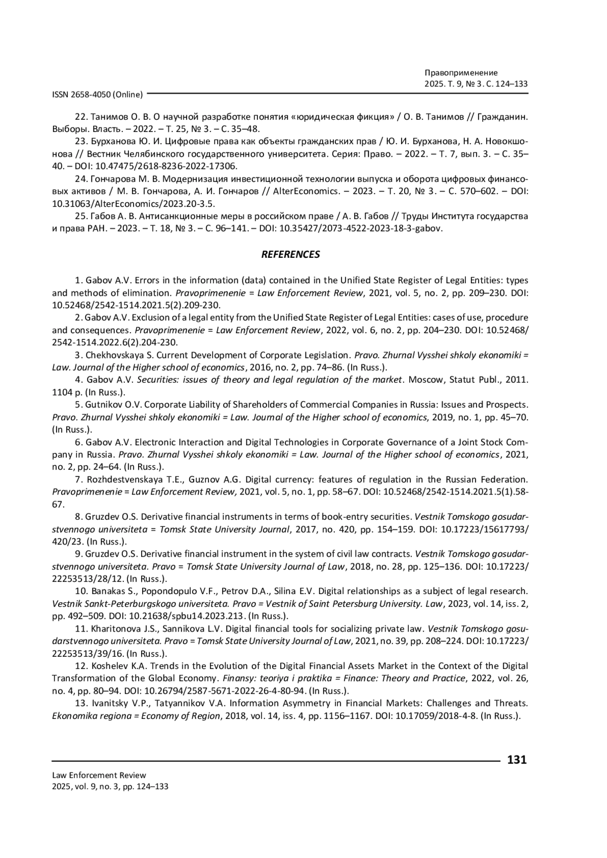 2. Габов А. В. Исключение юридического лица из Единого государственного реестра юридических лиц: случаи использования, порядок и последствия / А. В. Габов // Правоприменение. - 2022. - Т. 6, № 2. - С. 204-230. - https://doi.org/10.52468/2542-1514.2022. 6(2).204-230.