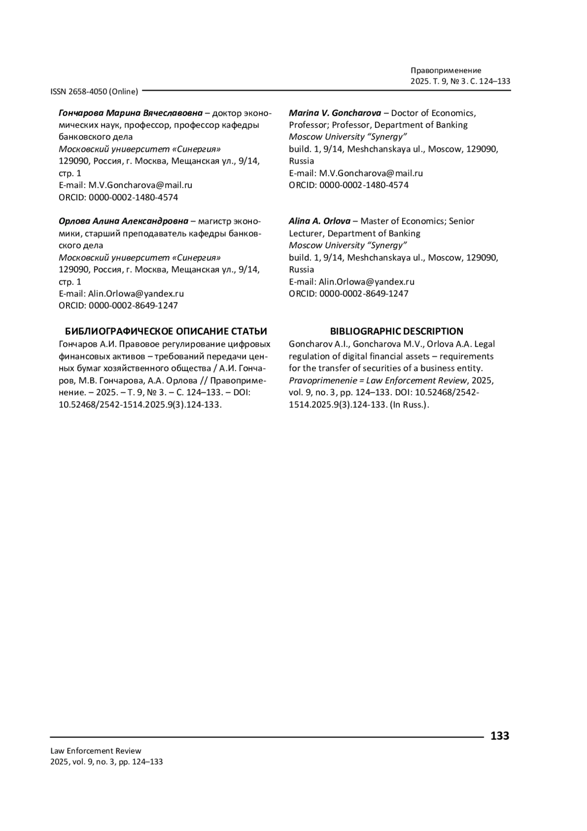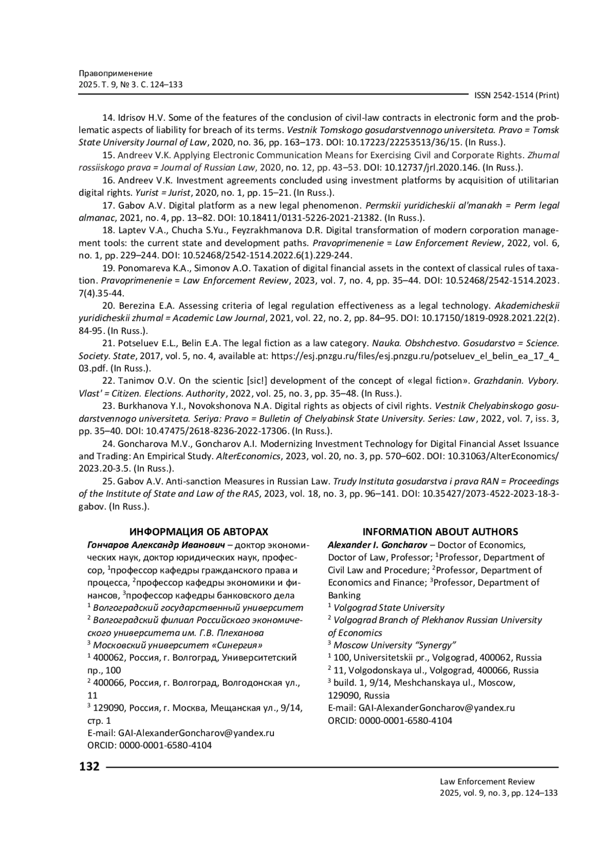 24. Гончарова М. В. Модернизация инвестиционной технологии выпуска и оборота цифровых финансовых активов / М. В. Гончарова, А. И. Гончаров // AlterEconomics. - 2023. - Т. 20, № 3. - С. 570-602. - https://doi.org/10.31063/AlterEconomics/2023.20-3.5.