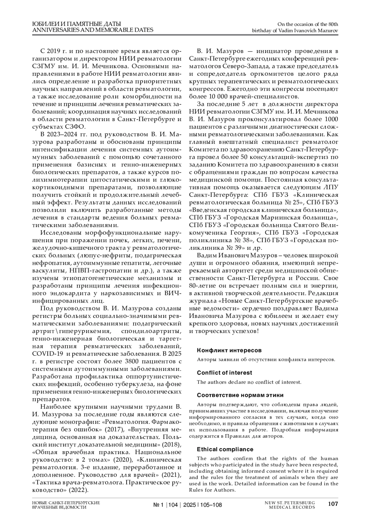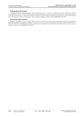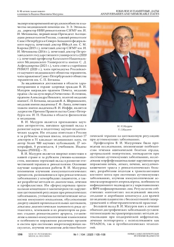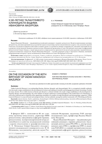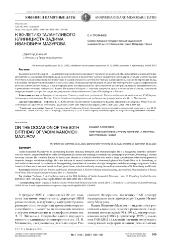 ТРОФИМОВ Е. А. К 80-ЛЕТИЮ ТАЛАНТЛИВОГО Е. А. ТРОФИМОВ КЛИНИЦИСТА ВАДИМА ИВАНОВИЧА МАЗУРОВА // НОВЫЕ САНКТ-ПЕТЕРБУРГСКИЕ ВРАЧЕБНЫЕ ВЕДОМОСТИ. 2025. № 1, ТОМ 104
