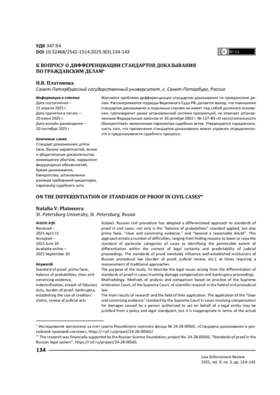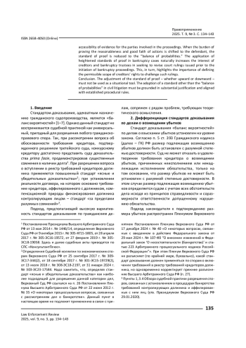 Изучается проблема дифференциации стандартов доказывания по гражданским делам. Рассматриваются подходы Верховного Суда РФ, делается вывод, что повышение стандартов доказывания в отдельных случаях не имеет под собой должного основания, противоречит ранее установленной системе презумпций, не отвечает установленным Федеральным законом от 26 октября 2002 г. № 127-ФЗ «О несостоятельности (банкротстве)» механизмам пересмотра судебных актов. Утверждается парадоксальность того, что применение стандартов доказывания может угрожать определенности и предсказуемости судебного процесса.