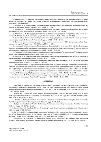 1. Акужинов А. С. Больше хочешь - меньше получишь: исследование зависимости между размером исковых требований и их удовлетворяемостью в российских арбитражных судах / А. С. Акужинов, О. В. Дорошина, В. А. Култаев, Д. А. Скугаревский, Д. А. Фаталиева // Вестник экономического правосудия Российской Федерации. - 2022. - № 11. - С. 161-190. - https://doi.org/10.37239/2500-2643-2022-17-11-161-190.