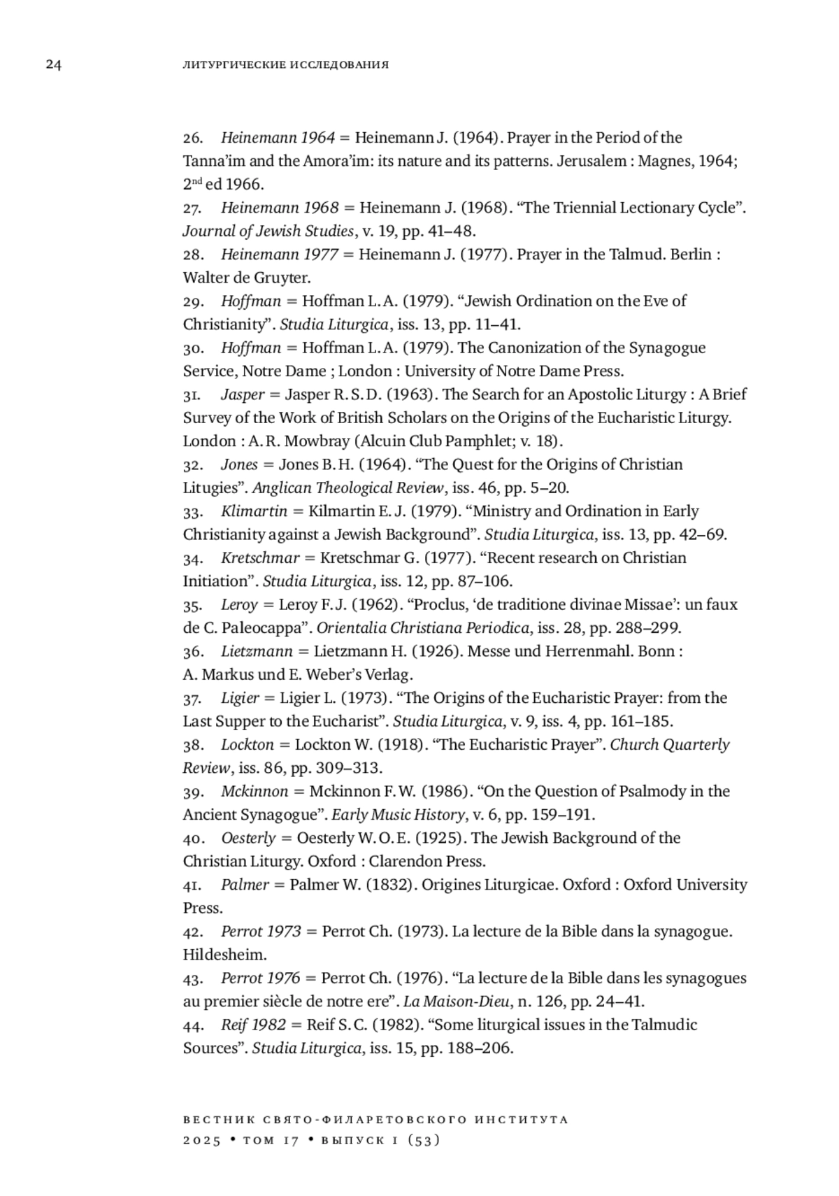 33. 	Kilmartin E. J. (1979). “Ministry and Ordination in Early Christianity against a Jewish Background”. Studia Liturgica, iss. 13, pp. 42-69.