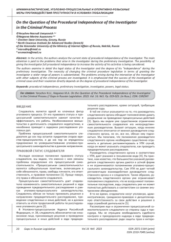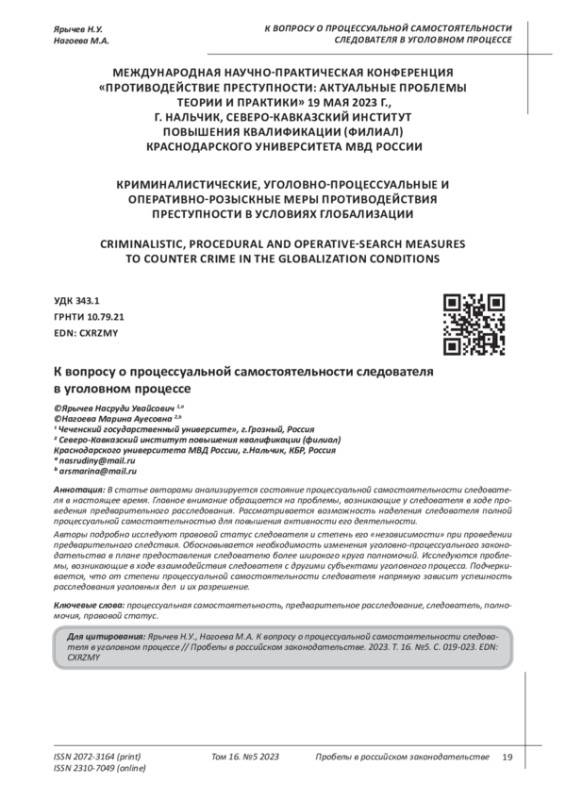 Grigoriev S.P. Procedural independence of an investigator in criminal proceedings // Naukosphere. - 2023. - p. 405 - 410.