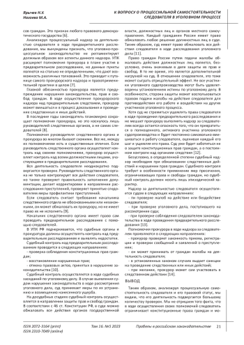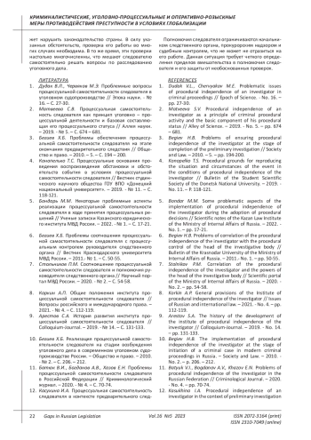 8. Коркин А.П. Общие положения института процессуальной самостоятельности следователя // Вопросы российского и международного права. - 2021. - № 4. - С. 112-119. EDN: IMSAJW