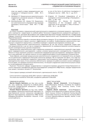 10. Бегиев Х.Б. Реализация процессуальной самостоятельности следователя на стадии возбуждения уголовного дела в современном уголовном судопроизводстве России. - Общество и право. - 2010. - № 2. - С. 206. - 212. EDN: NDAXYV