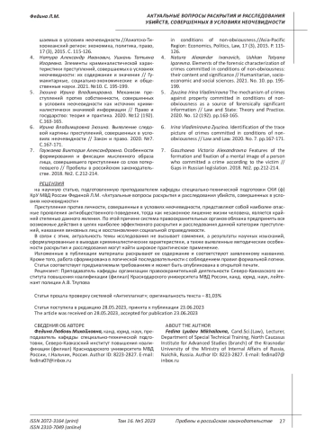 7. Гаужаева Виктория Александровна. Особенности формирования и фиксации мысленного образа лица, совершившего преступление со слов потерпевшего // Пробелы в российском законодательстве. 2018. №2. С.212-214. EDN: YVMCNZ