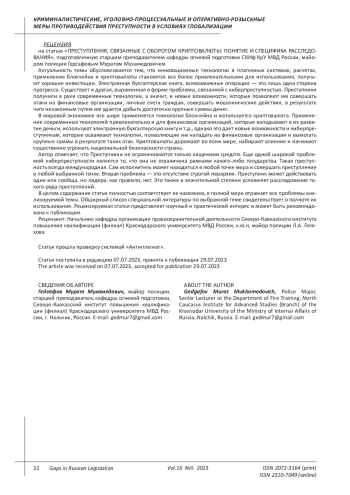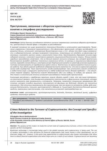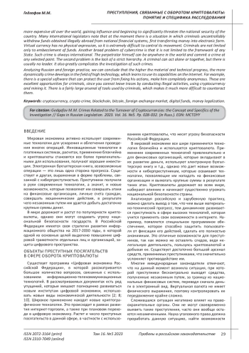 Целью данного исследования является изучение современного состояния оборота криптовалюты, преступлений в данной сфере и специфики их расследования. В мировой экономике все шире применяется технология блокчейна и используется криптовалюта. Применение современных технологий привлекательно и для финансовых организаций, которые вкладывают в их развитие деньги, используют электронную бухгалтерскую книгу и т. д., однако это дает новые возможности и киберпреступникам, которые осваивают технологии, позволяющие им нападать на финансовые организации и вымогать крупные суммы в результате таких атак. Криптовалюты дорожают во всем мире, набирают влияние и начинают существенно угрожать национальной безопасности страны. Многие международные законодатели отмечают, что на данный момент возникла ситуация, при которой преступники бесконтрольно выводят средства, полученные незаконным путем, за границу из национальных финансовых систем, переводя сначала деньги в электронный вид. Виртуальная валюта не имеет физического выражения, поэтому контролировать ее передвижение крайне сложно. Преступники не ограничиваются только хищением средств. Еще одной широкой проблемой киберпреступности является то, что она не ограничена рамками какого-либо государства. Такая преступность всегда международная. Сам исполнитель может находиться в любой точке мира и совершать преступление в любой выбранной точке. Вторая проблема - это отсутствие строгой иерархии. Преступник может действовать один или сообща, но лидера, как правило, нет. Это также в значительной степени усложняет расследование такого рода преступлений. Анализируя российскую и зарубежную практику, можно сделать вывод о том, что чем выше материально-технический прогресс, тем динамичнее развивается преступность в сфере высоких технологий, которая учится применять свои возможности в интернете. Например, появляется специальное программное обеспечение, которое способно защитить пользователя от фиксации его действий, сделать его полностью анонимным. Это отличные возможности для преступников, так как можно не оставлять следов, ведя нелегальную деятельность, пользуясь криптовалютой и добывая ее. Существует достаточно большой арсенал средств, применимых преступниками, что значительно усложняет противодействие им.