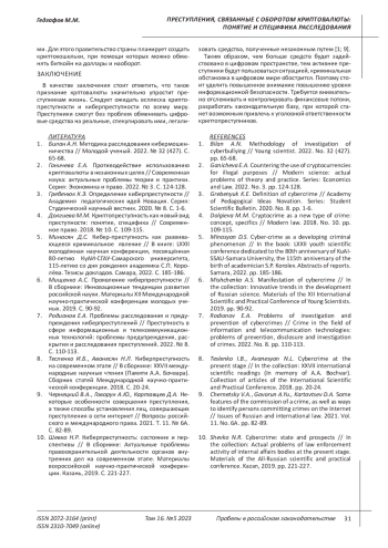 2. Ганичева Е.А. Противодействие использованию криптовалюты в незаконных целях // Современная наука: актуальные проблемы теории и практики. Серия: Экономика и право. 2022. № 3. С. 124-128. EDN: GJKREV